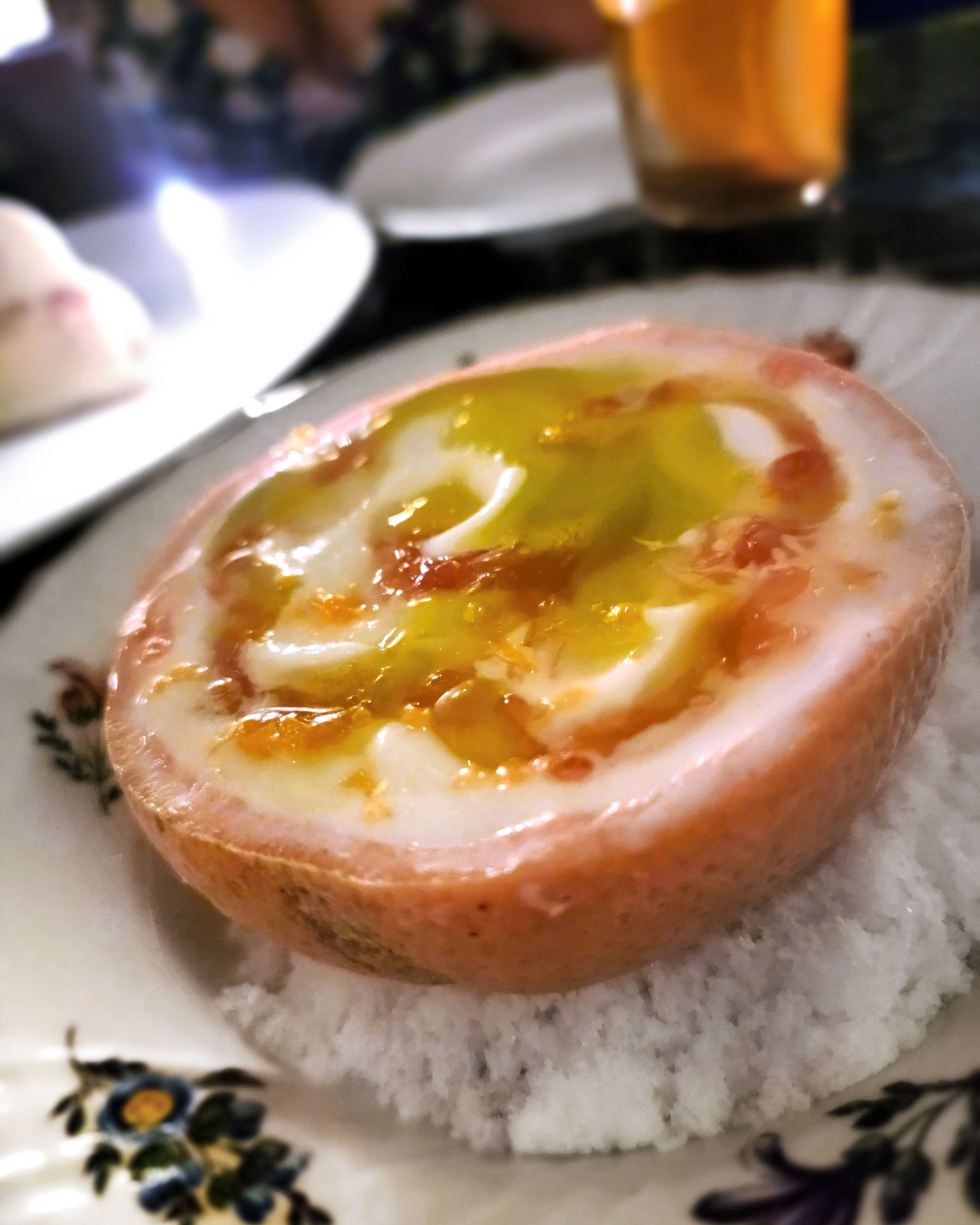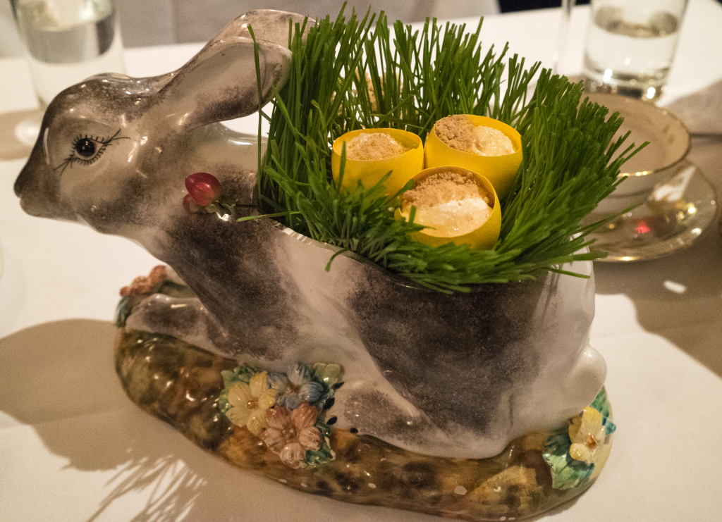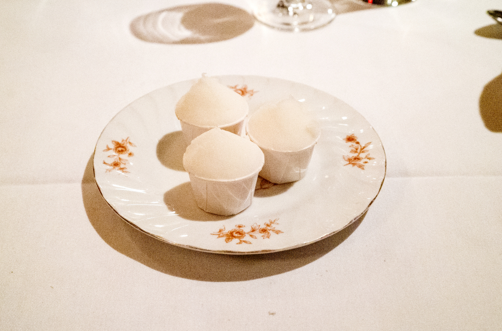 Whipped ricotta cheesecake with finger lime graham cracker dusting and olive oil, served in eggshells that sat on a porcelain rabbit’s ass area. Nice presentation. Great bite of cheesecake here. Very soft and creamy.
