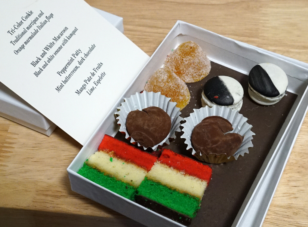 We were sent home with a little box of desserts as well. Nice touch. Out of the items listed on the paper, my favorite was the spicy mango gumdrop thing.