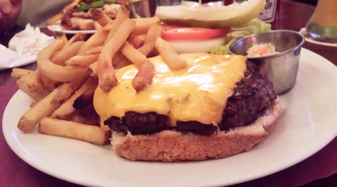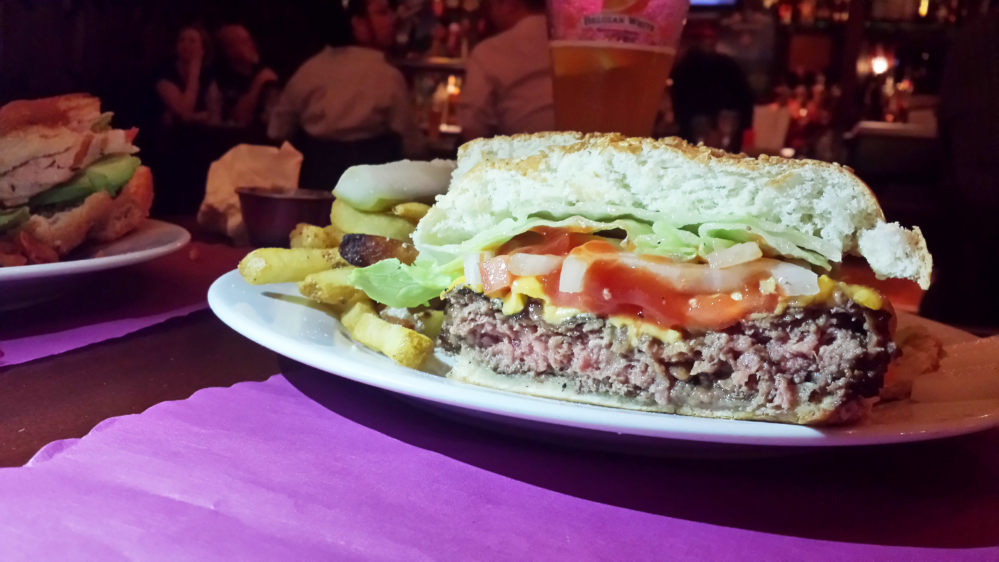 The main reason for our visit was burgers. Of course my puss-bag friend went with a turkey burger because he’s watching his girlish figure, but I took down the Brew Burger with American cheese and jalapeños.
