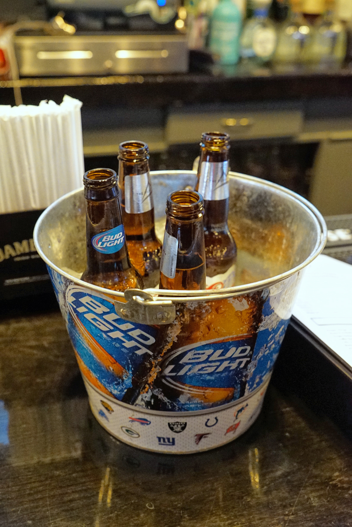 We scored a sweet Gilt City deal for this place: $30 gets you a bucket of suds (six of either Bud, Bud Light, or Coors Light – you can also mix and match), and a pair of burger plates.
