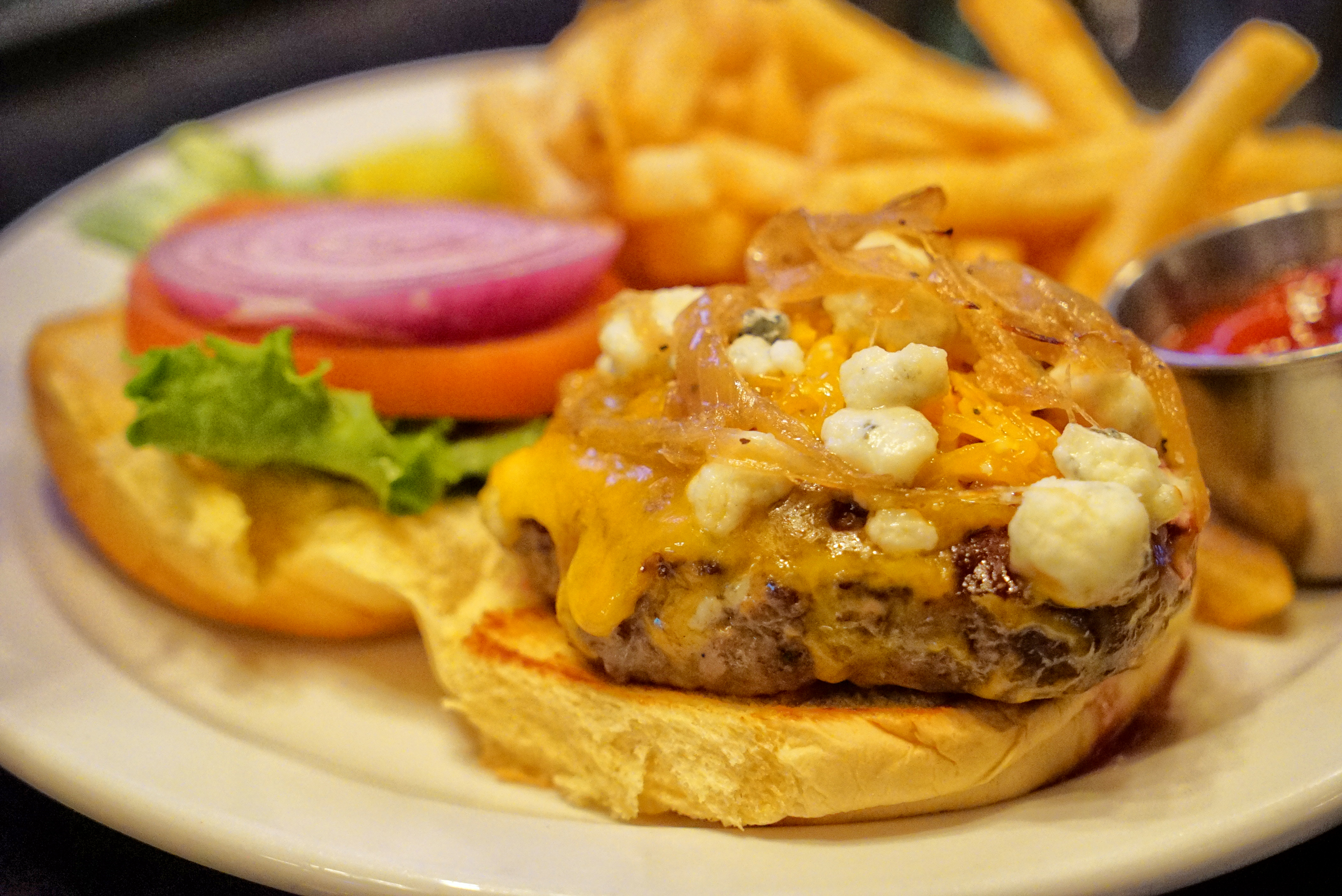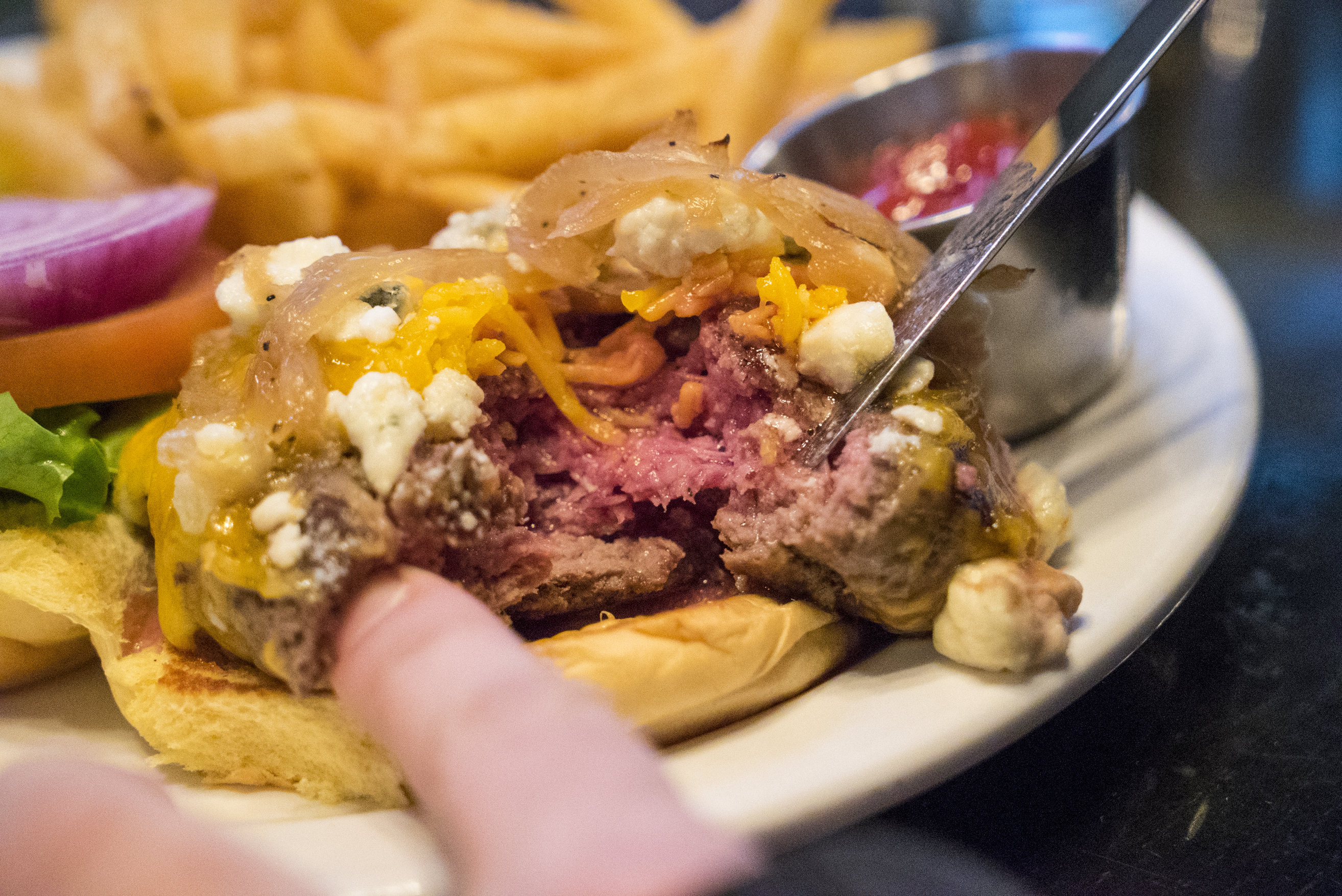 My buddy went with the black & blue burger on the bartender Kyle’s recommendation (great bartender, by the way), which is topped with blue cheese and caramelized onions. As you can see below, his was undercooked a bit (he ordered medium), but he still loved the flavors.