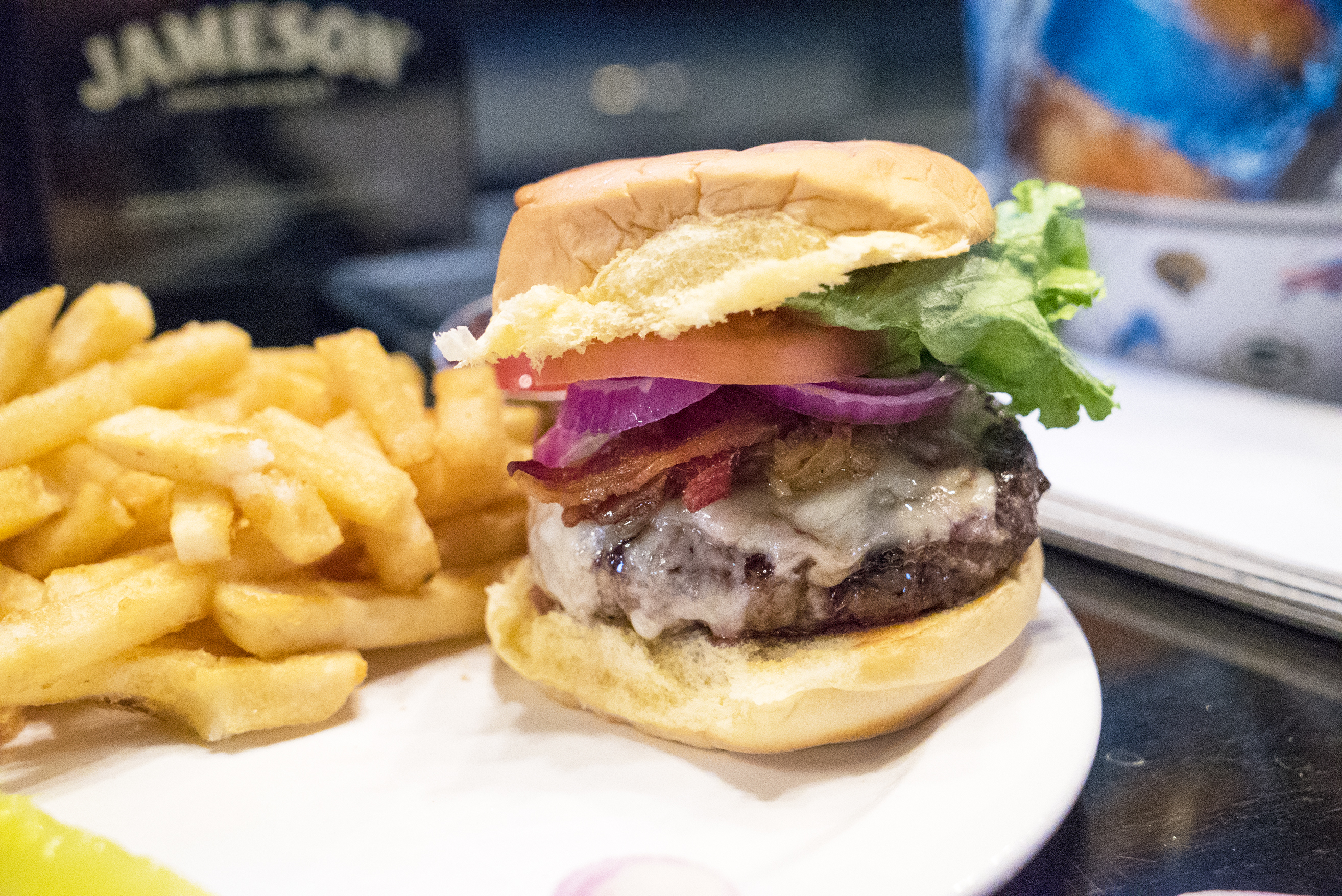 The food tasting continued with the special half pound burger that comes topped with bacon, American cheese and tomato on a pretzel bun.