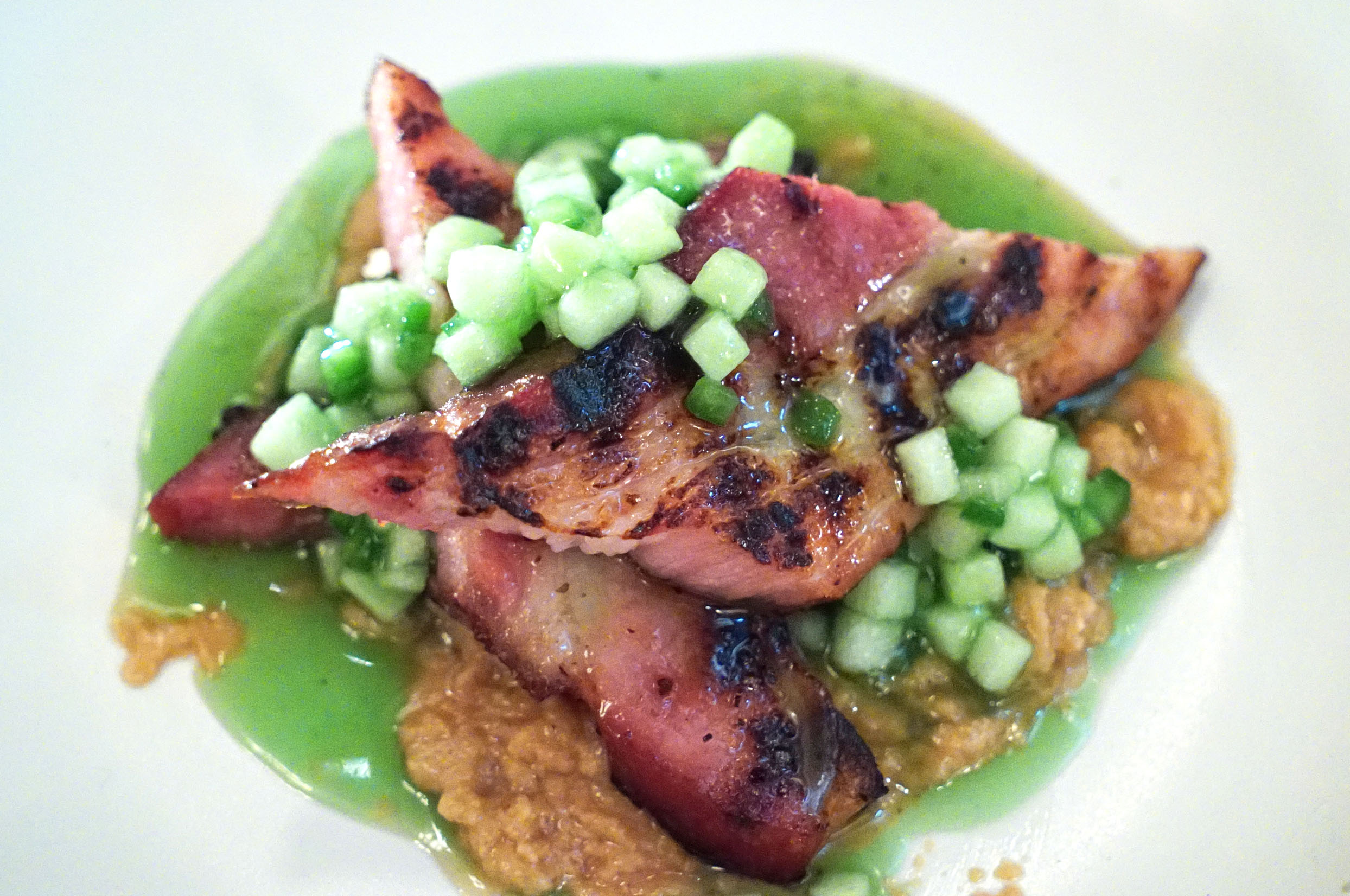 We chased that with the corn custard brûlée. I had high hopes for this, but it fell short for two reasons: (1) The inside was less custard and more clumpy scrambled egg. This is usually a turn off for me, but the flavor was really good, so I still devoured it. And (2), a bit heavy on the caramelized sugar on top. Too thick for my liking. The flake salt, however, really made the flavors on this pop. I can see this side being a star with a bit more fine tuning.