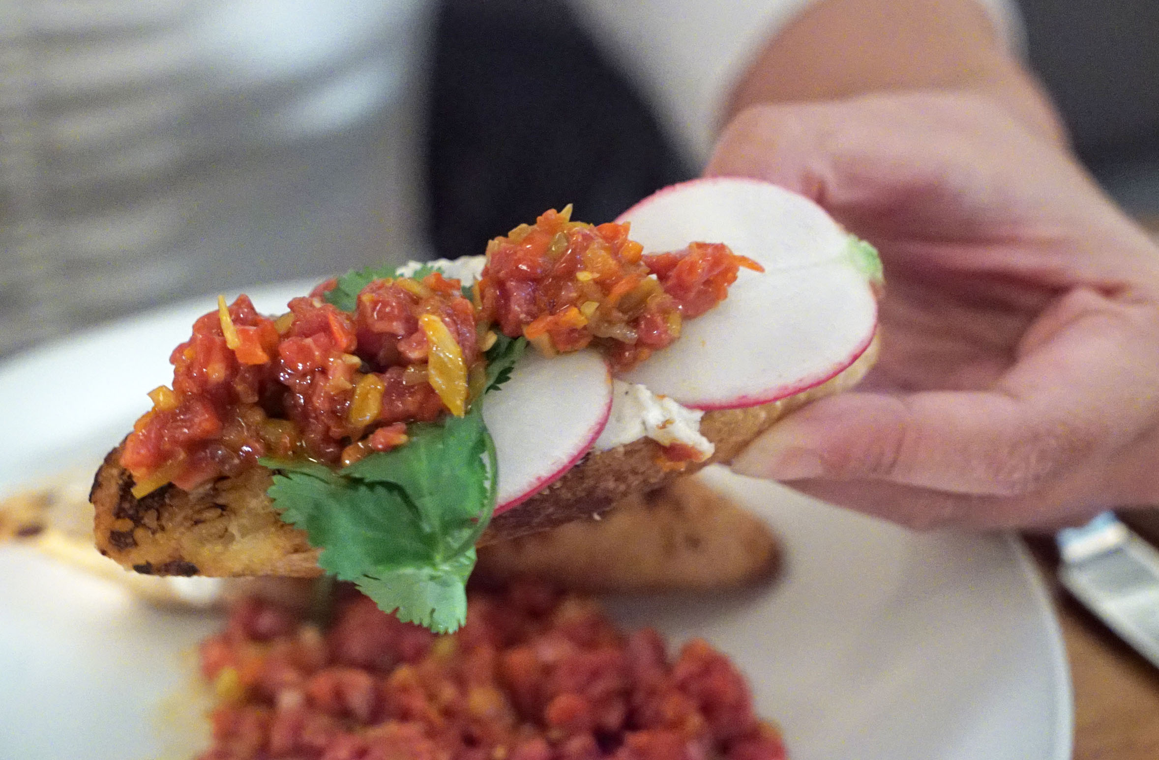 The toast came with a marrow butter and radishes. The butter was really creamy and beefy, and the radish added a little bit of crunch element and a bright pop to the bite. The meat texture was soft and delicate, very tasty.