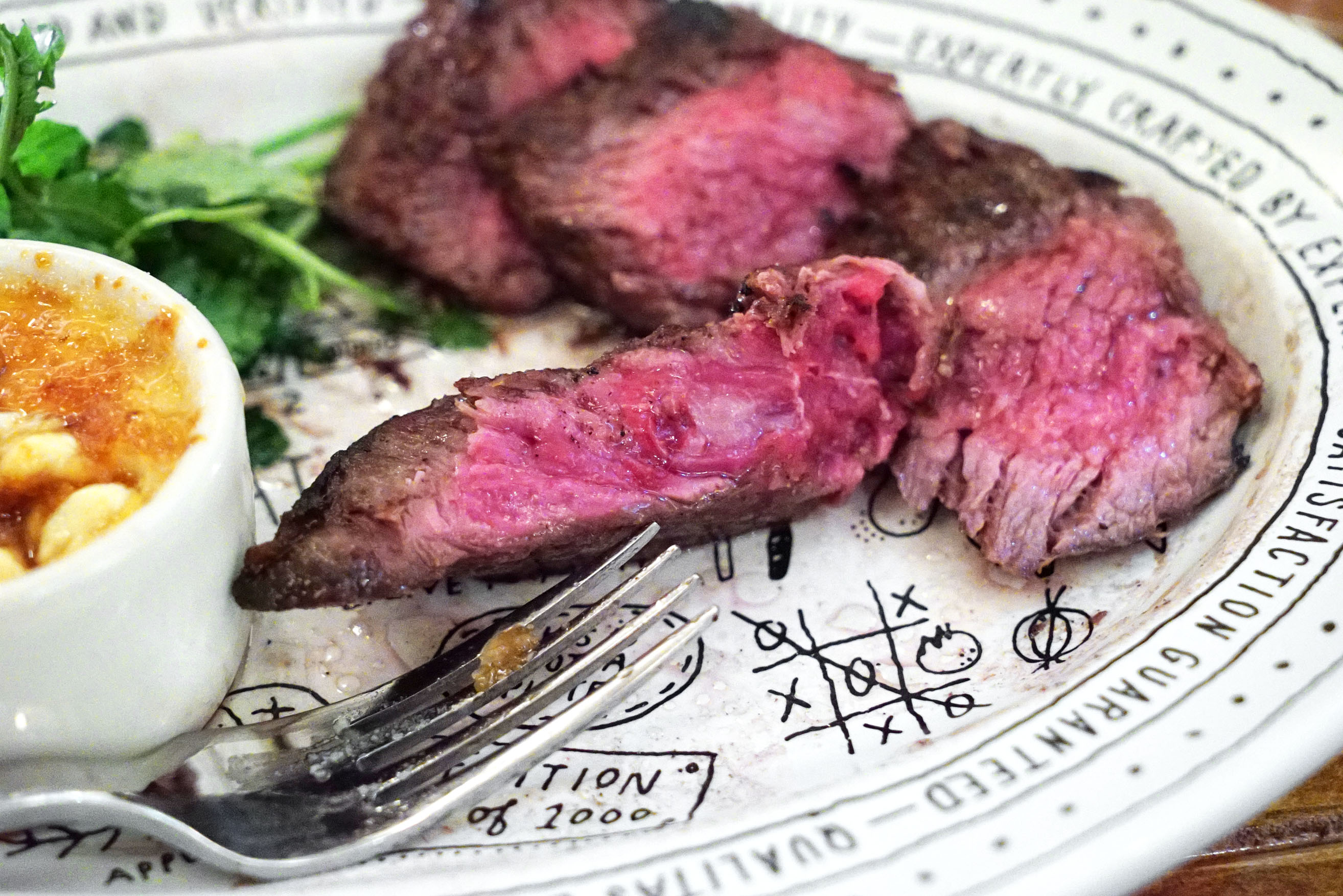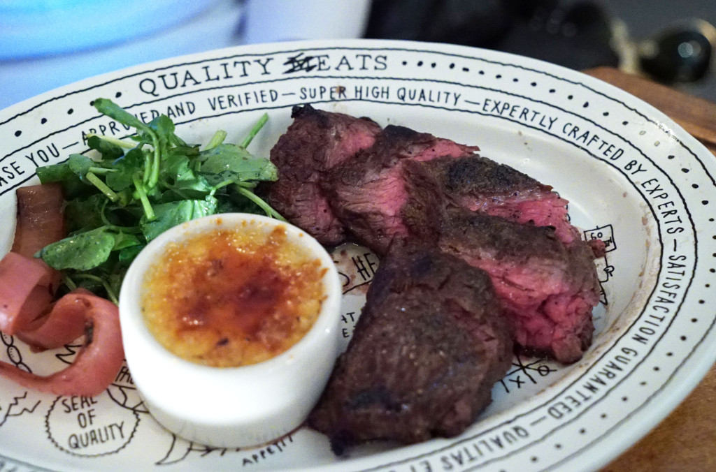 Here’s a look at the perfectly cooked, beautifully charred bavette steak. Both plates came with a cup of corn creme brûlée – sweet yet savory, and creamy as fuck – and some pickled red onion. I explain a little bit about this bavette cut down in the next section.