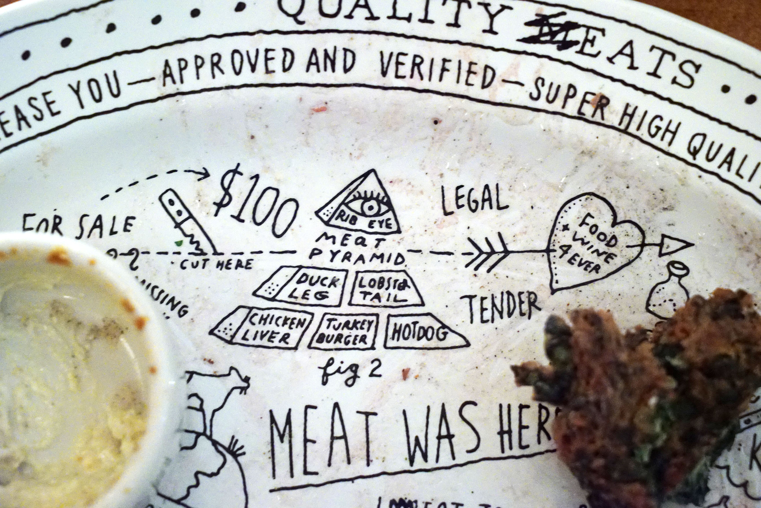 The details they put on everything, from the walls to the ceilings, to the cutlery and bathroom tiles, is all fun and light hearted (like the plates above). I like how the M on “Quality Meats” is made to look like it was scratched out or missing on all their logos and signage.