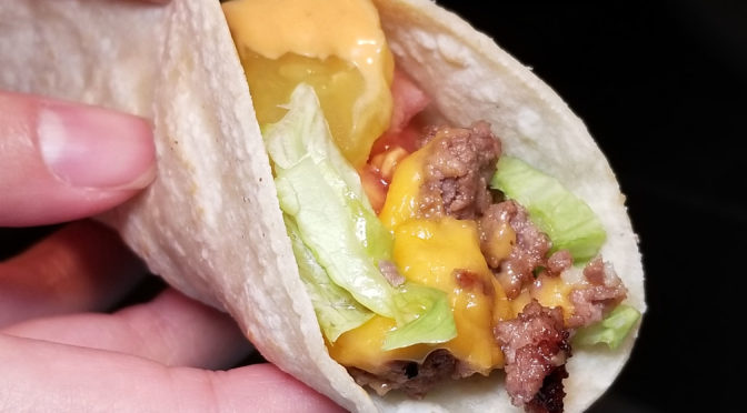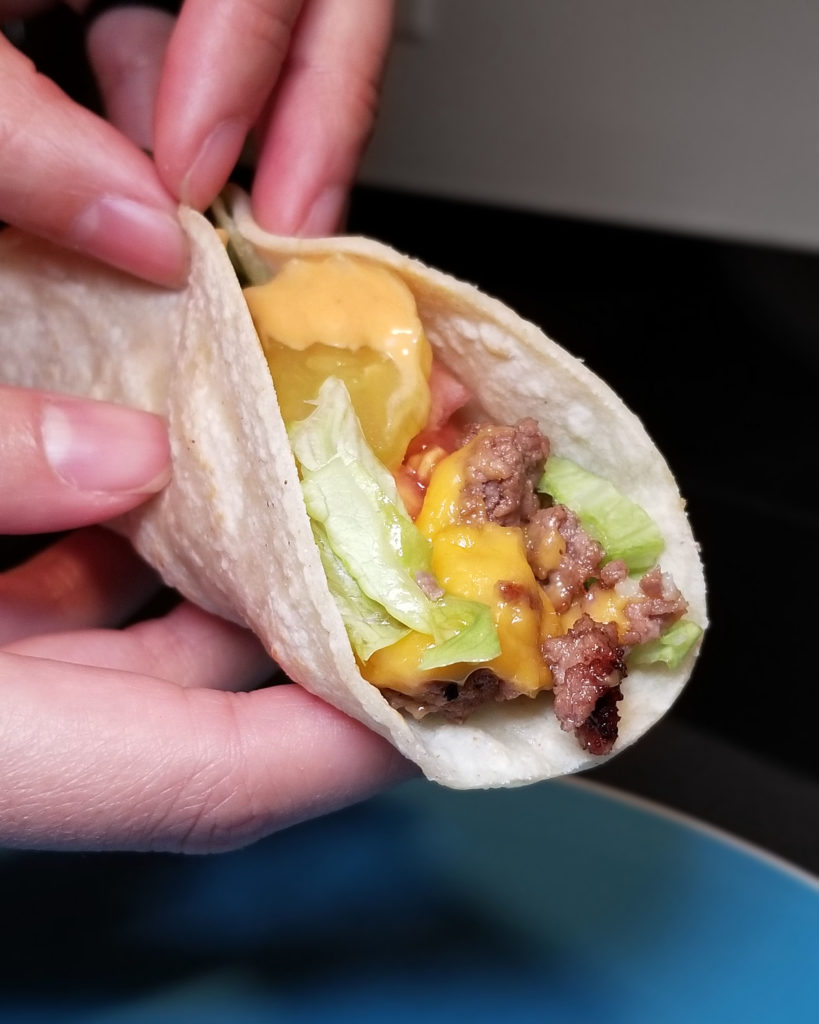 8. Scoop some of this “cheeseburger” mix into your taco shells.