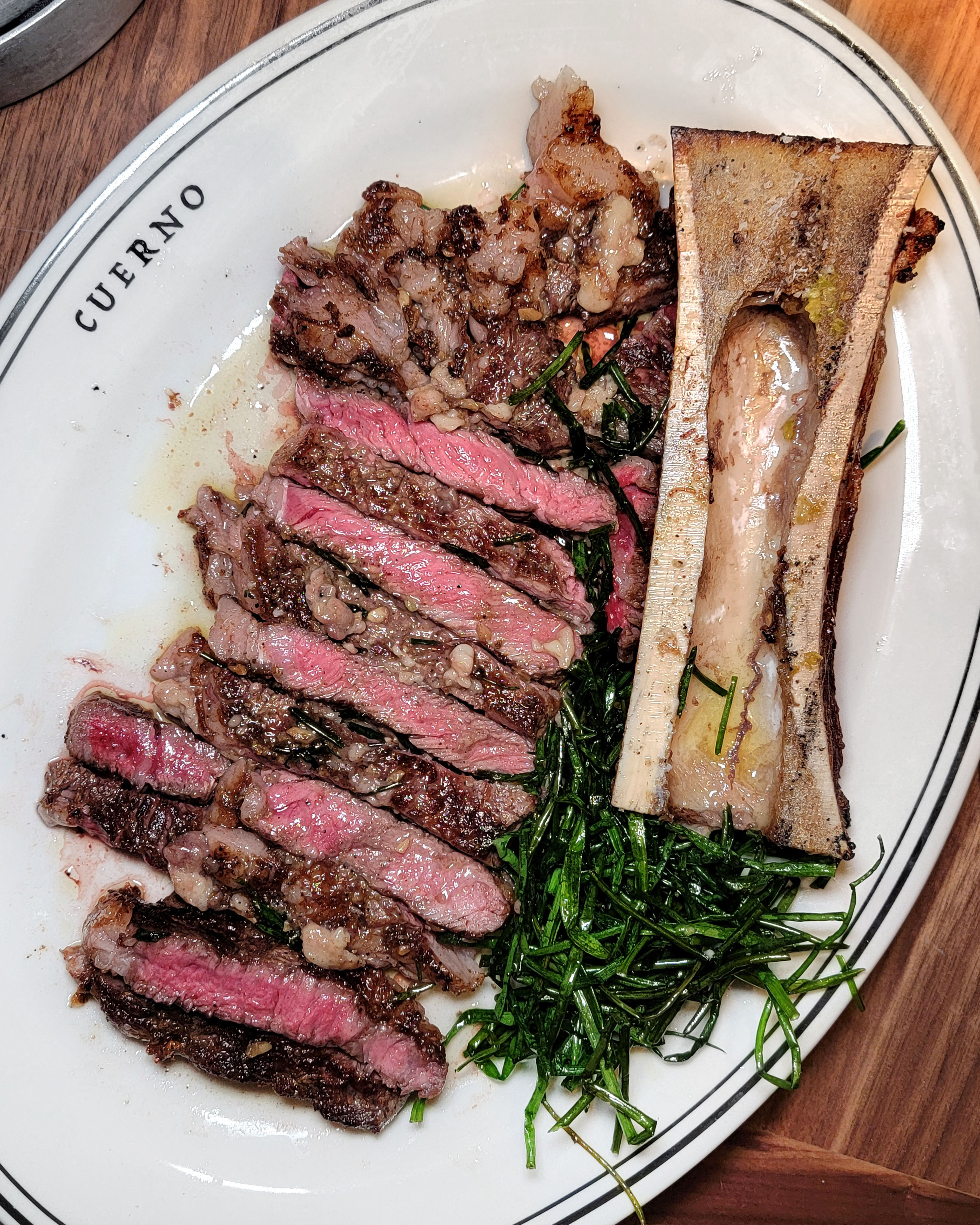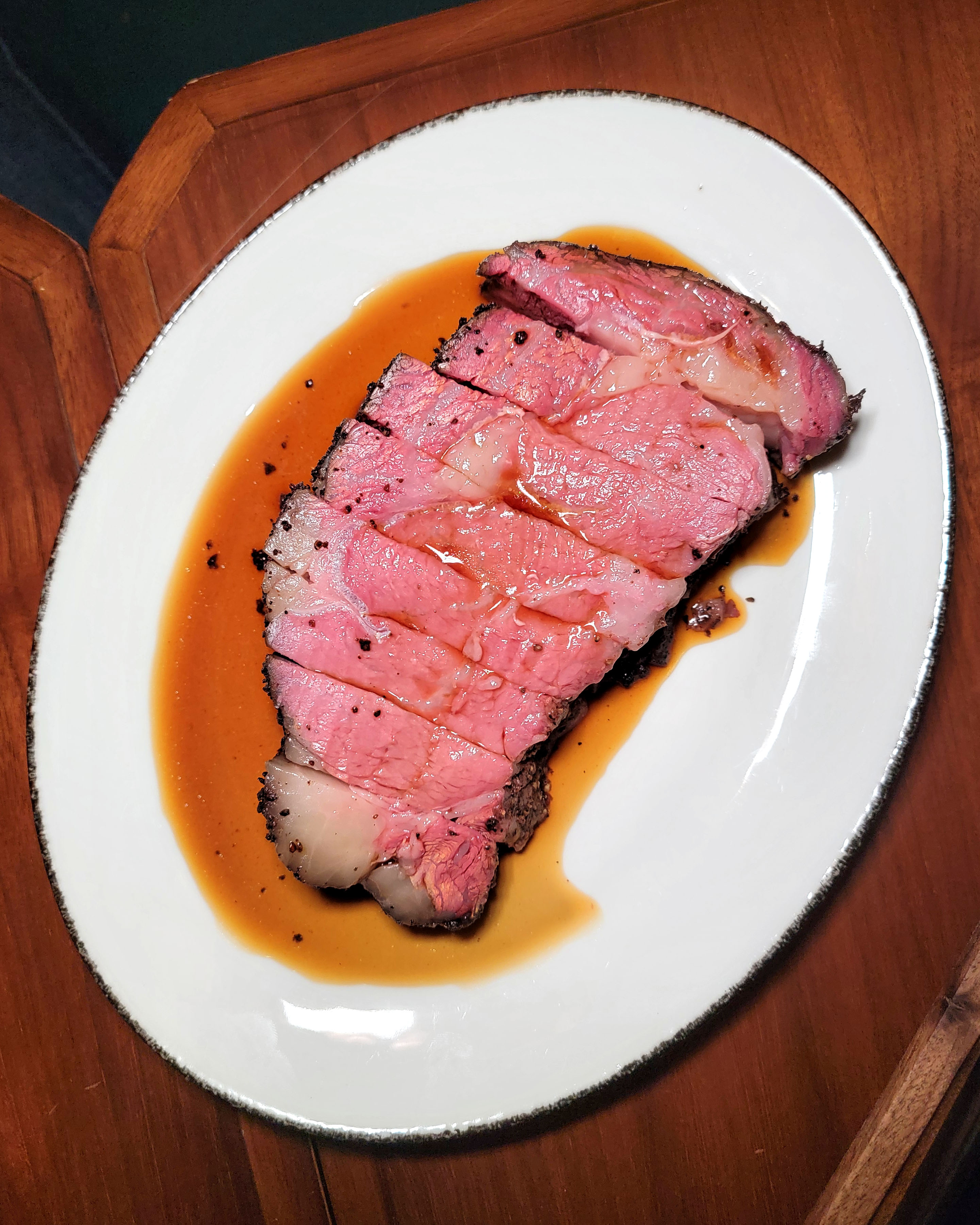 The rib eye ate almost like cured ham. It was cooked a bit under, but none of us minded. It was lean in the eye, but there was a ton of flavor in the cap. 8/10.