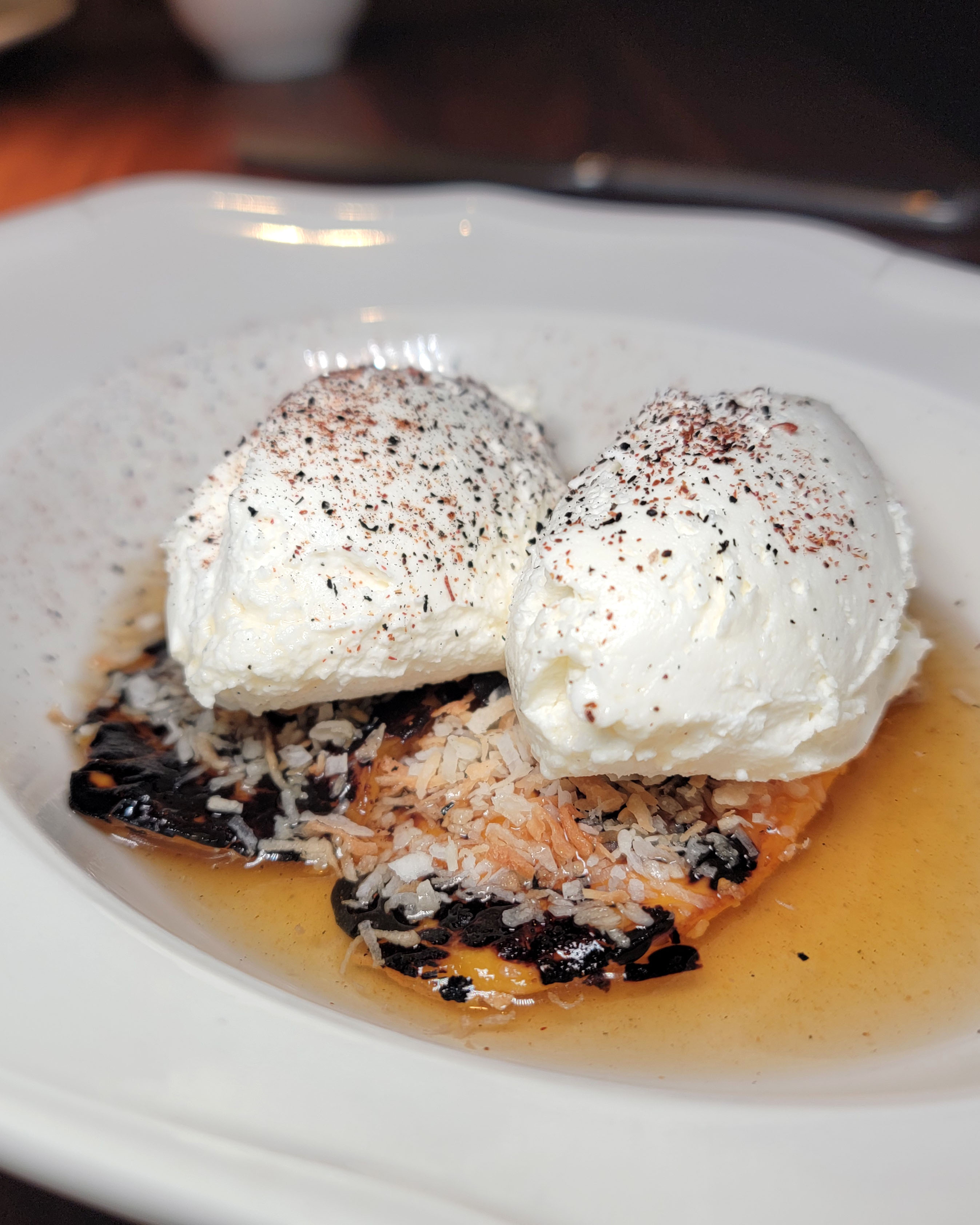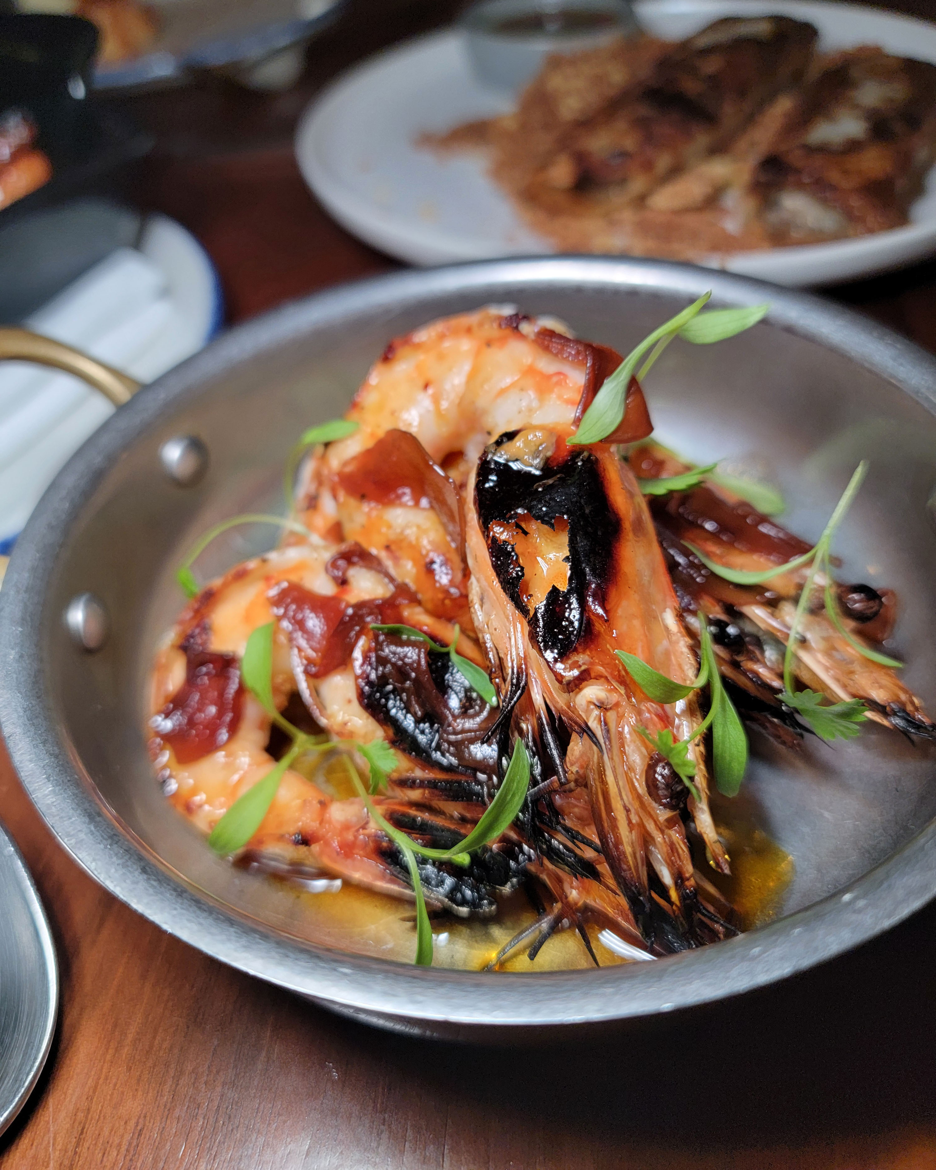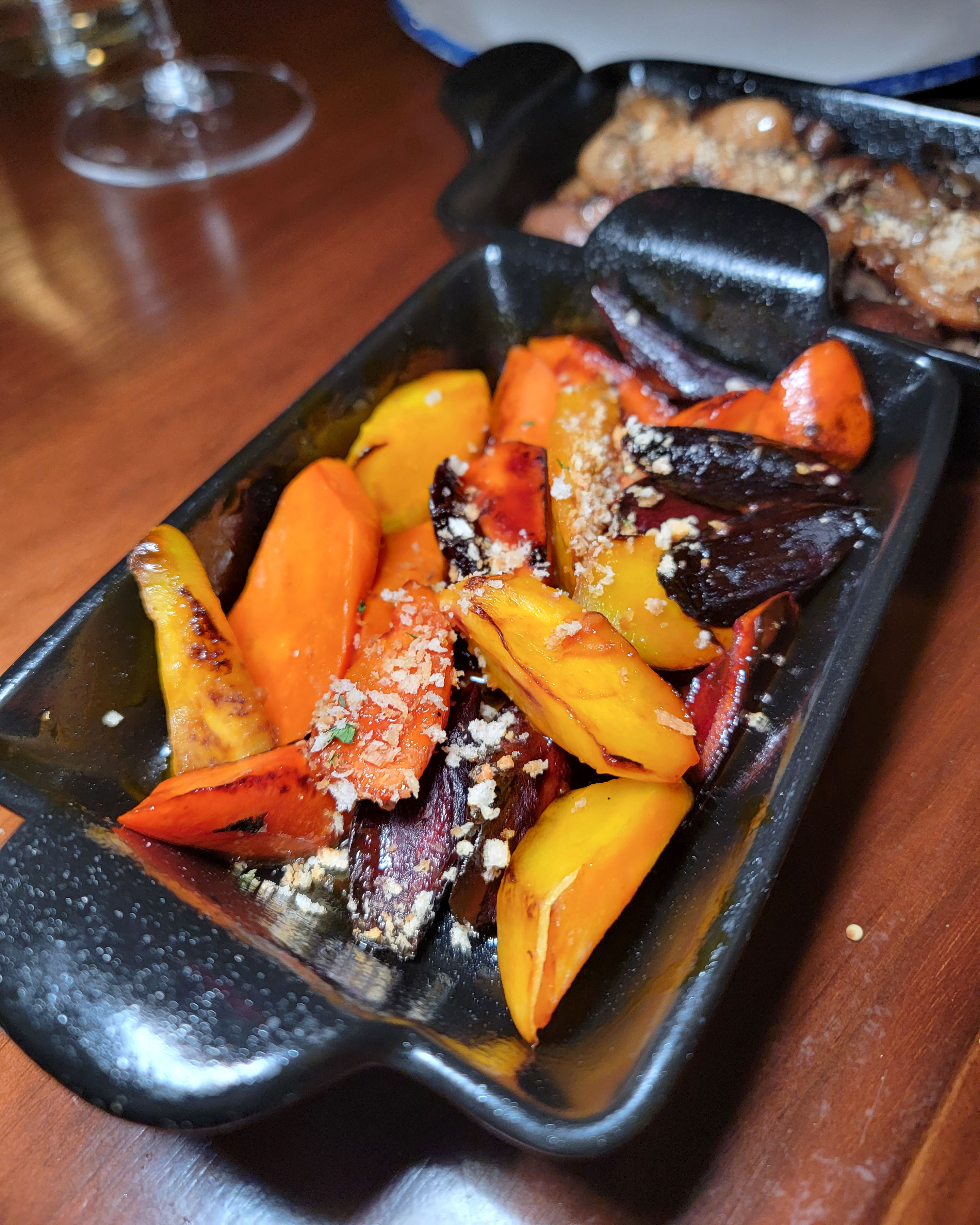 At first I thought maybe it was a tri-tip based on the shape, but the muscle striations seem to go the wrong direction for that. Based on the muscle fibers, I think this is in the sirloin family. Perhaps top butt/sirloin, or top sirloin. Either way it was perfectly cooked, had a great crust, and was artfully topped with a maitre’d butter and herbs. At $69 this is also a great deal for people to try the best of what can be on an otherwise under-utilized cut. 8/10.