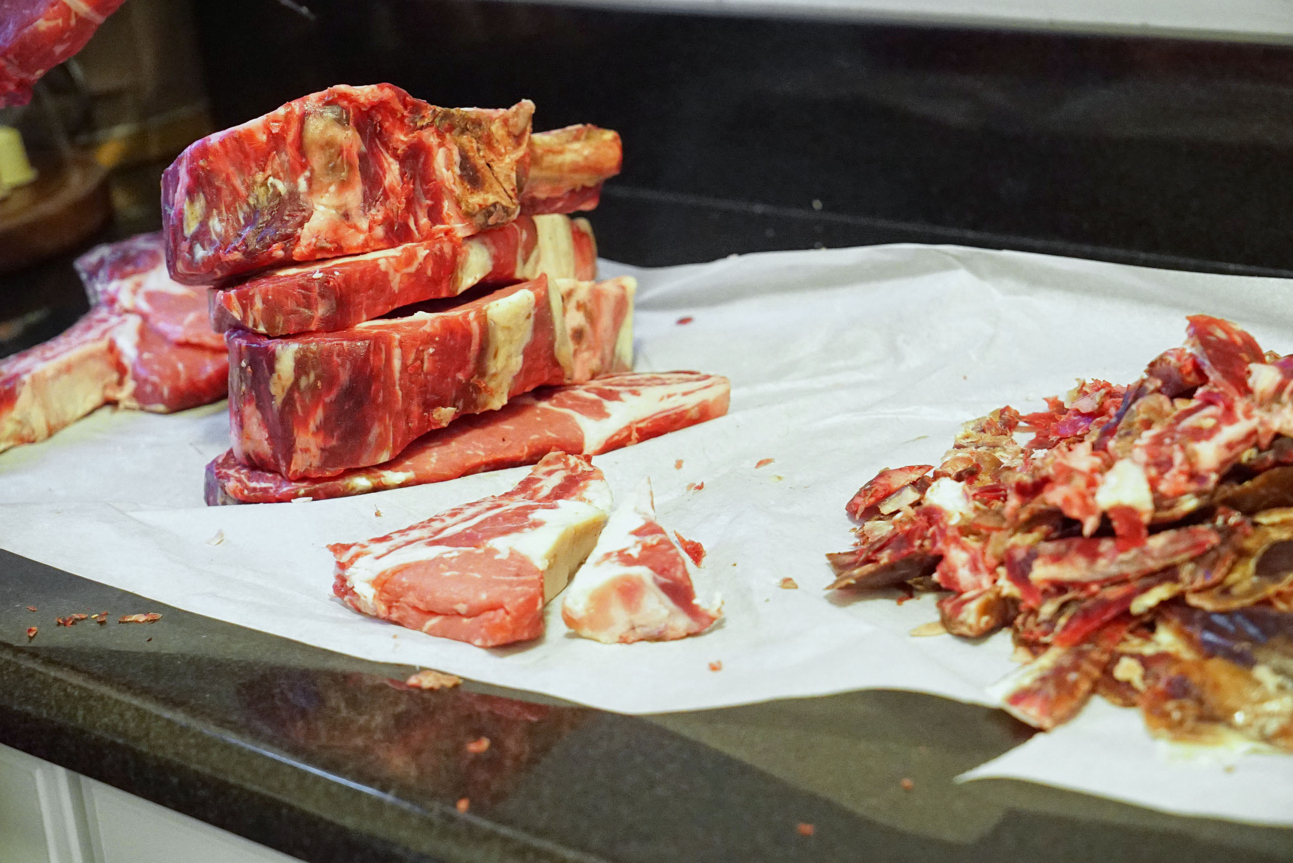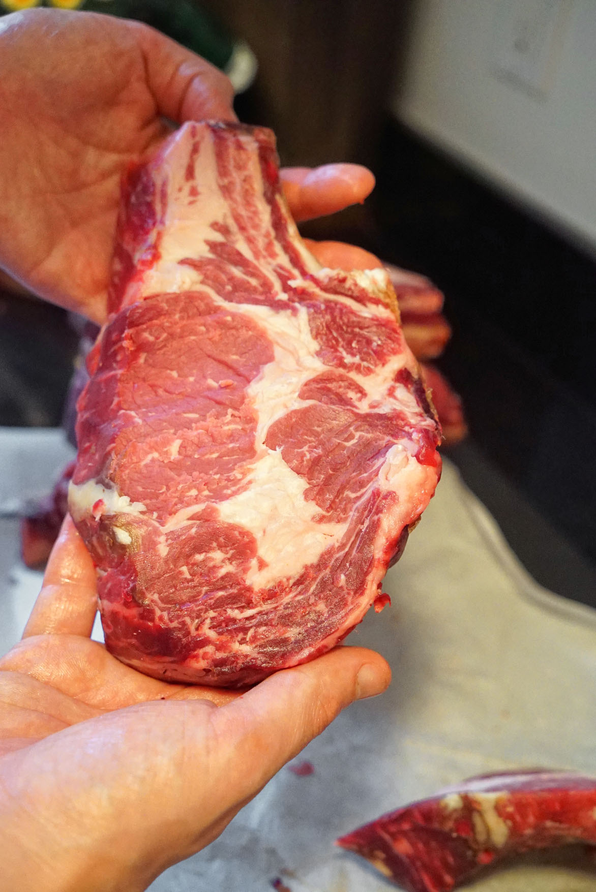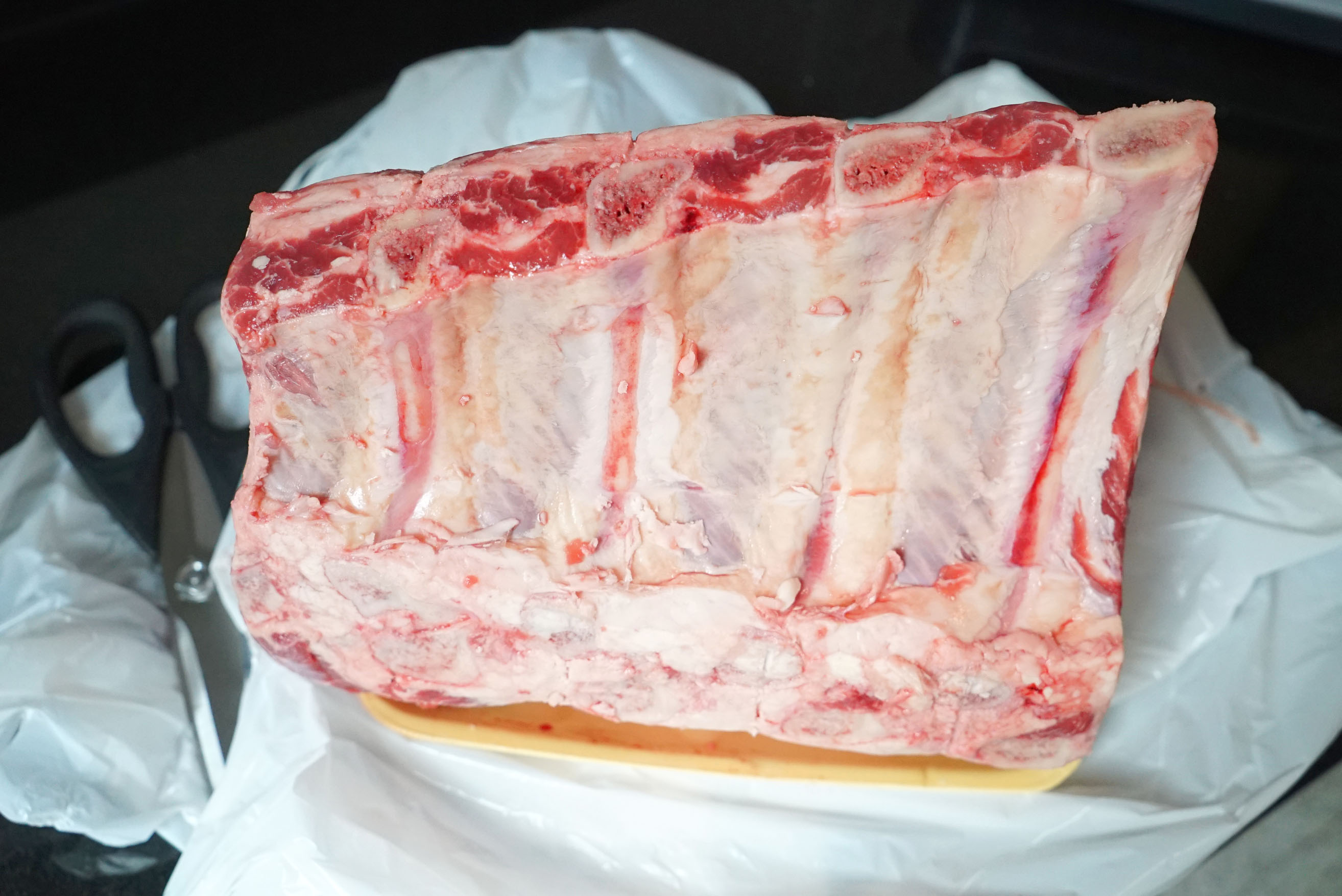 So I received my sample bags and ran out to the store to buy a nice rib roast, which I would later parse out into rib eye steaks after the aging is completed. NYC grocery stores don’t really have massive slabs of rib roasts sitting in the fridge section, so I had to ask the butcher what he had. He went to work for me, giving me a section of rib eyes with about four or five bones intact.