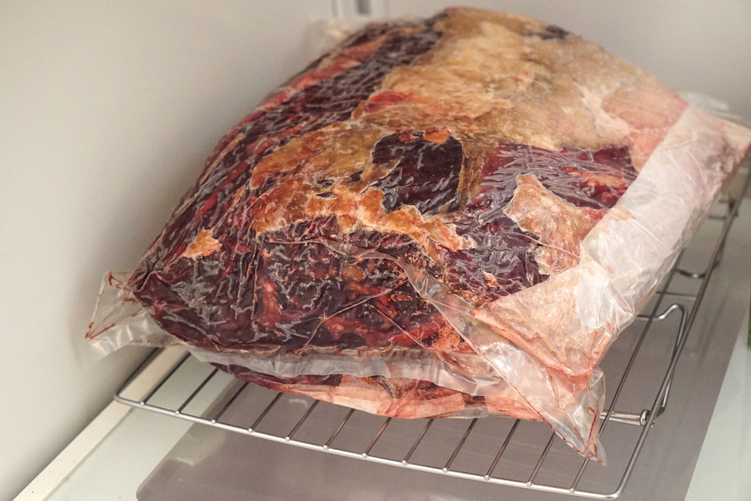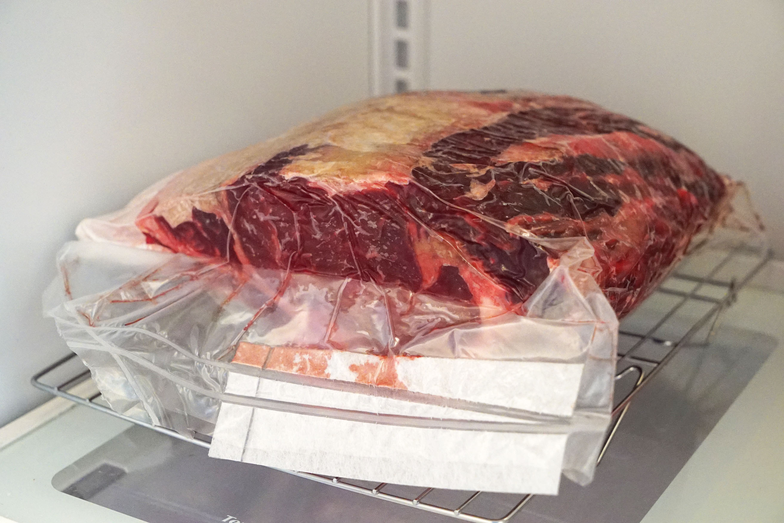 Final note: if your fridge is generally full, but you still want to age beef at home, I suggest getting a mini fridge, or a smaller dedicated separate fridge, just for beef. Put your temperature setting to about 35 degrees, and get a fan in there somehow to circulate the air. Always keep the beef elevated off the surface on a baking rack or something, too. No special aging bags necessary.