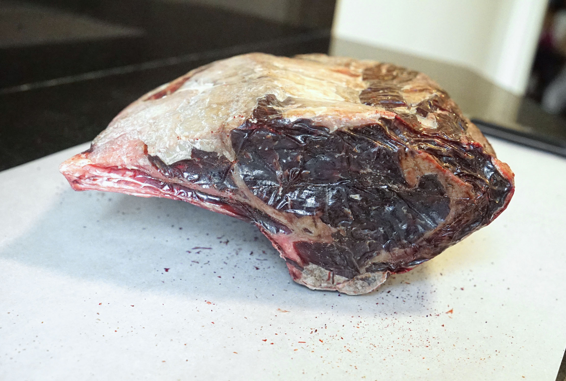 And another week or so. I notice it’s also shrinking. Dry-aging processes tend to cause the meat to desiccate to the point where you can lose almost a third of the original weight.