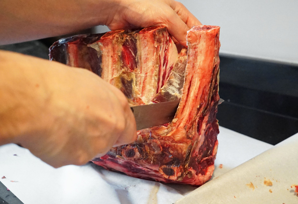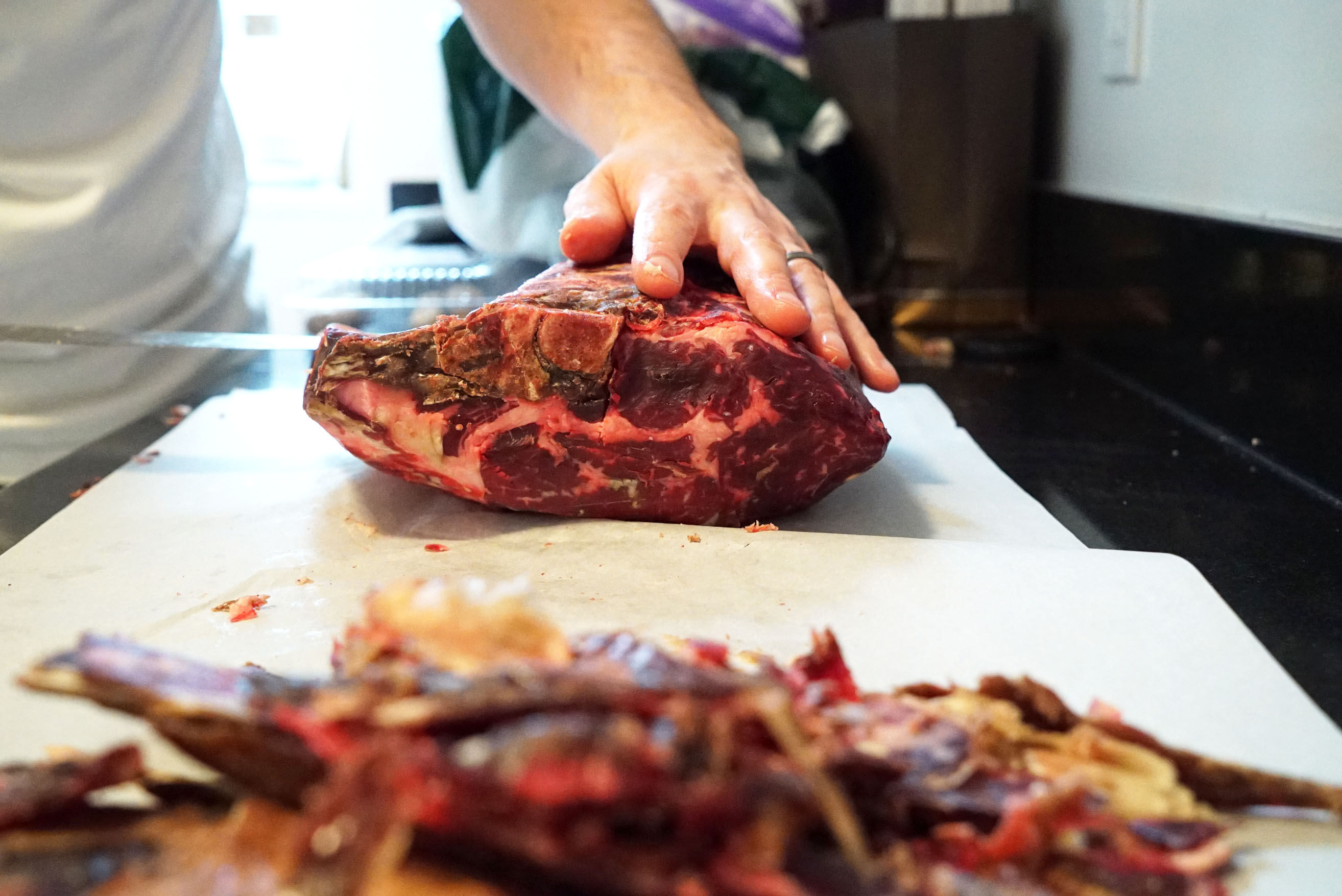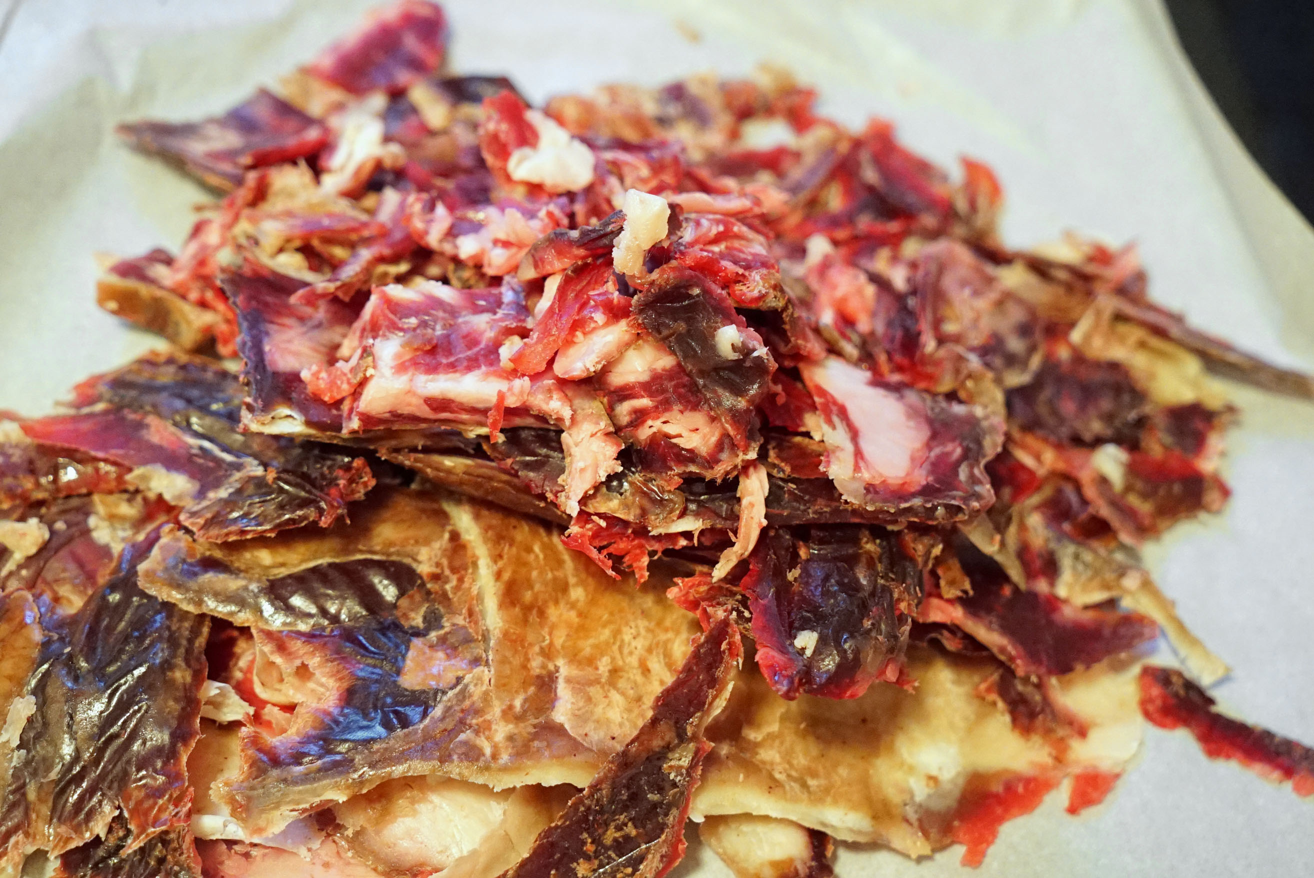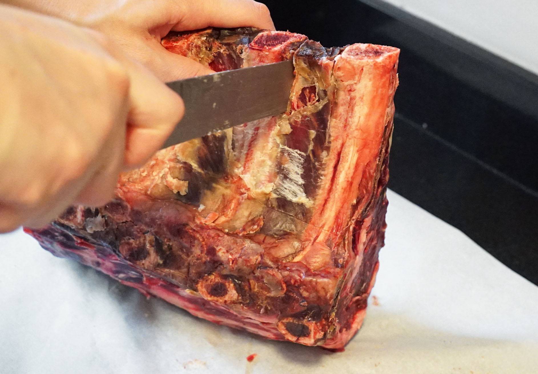 The outside bark, which has the texture of really hard beef jerky, needs to be sliced off of the underlying softened meat, and the tough skin membrane over the ribs needs to be peeled and picked off.