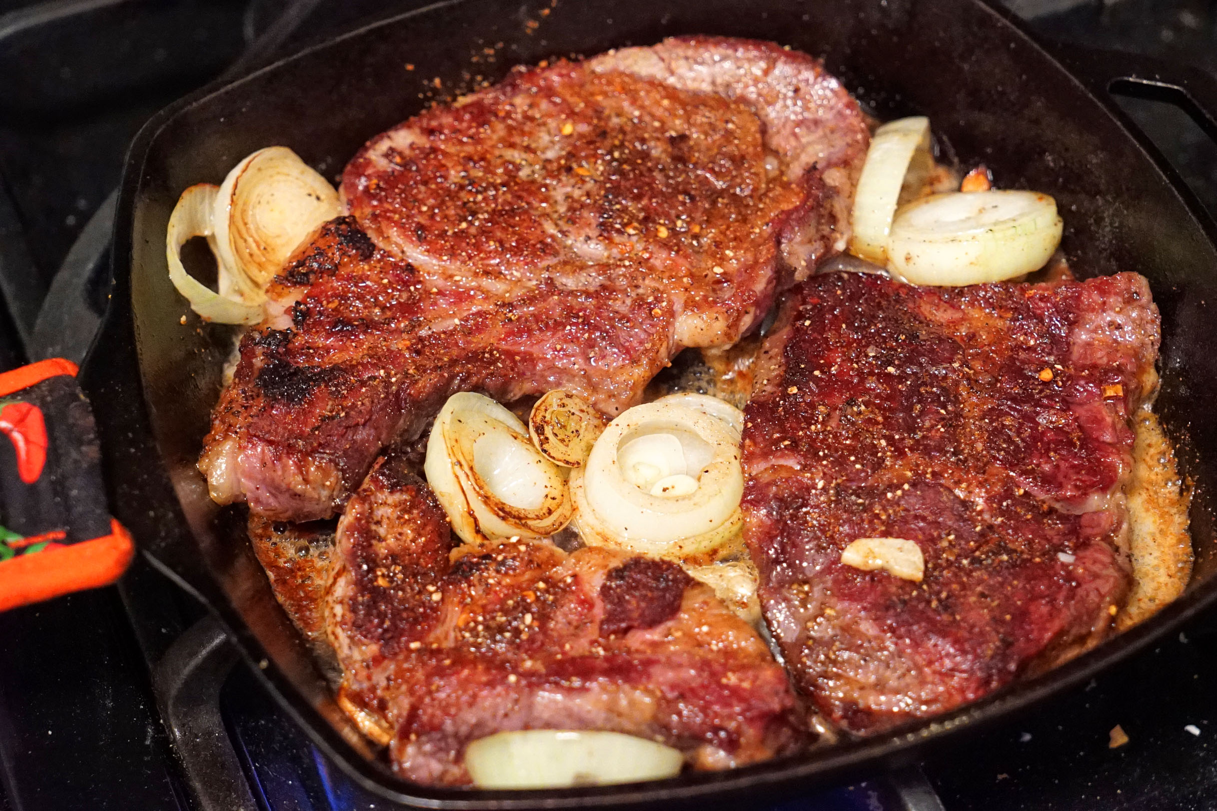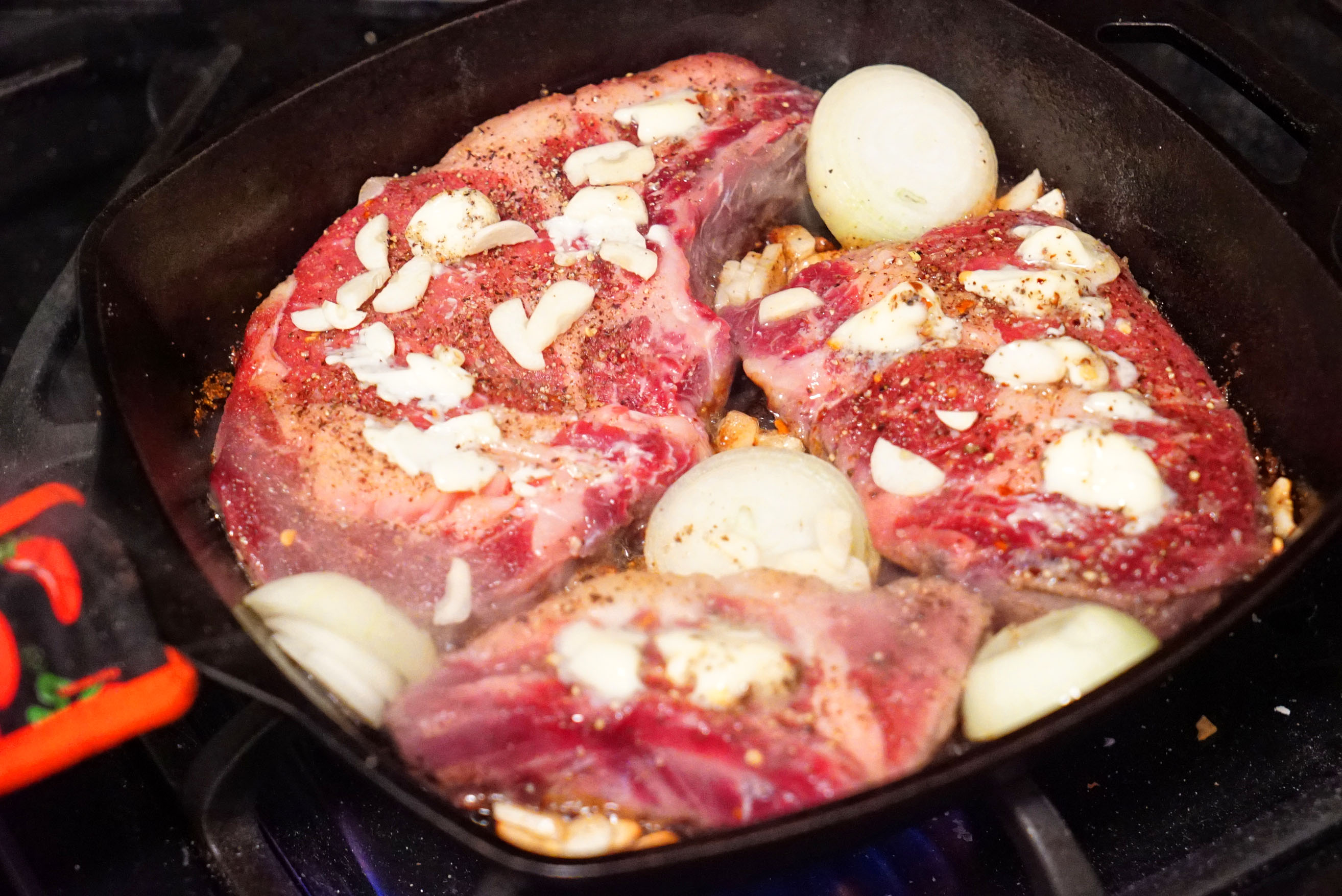 I ended up with two thinner boneless cuts, so I seasoned them up right away and seared them off in a cast iron skillet with some butter, garlic and onions (I cut one to fit them in the pan better).