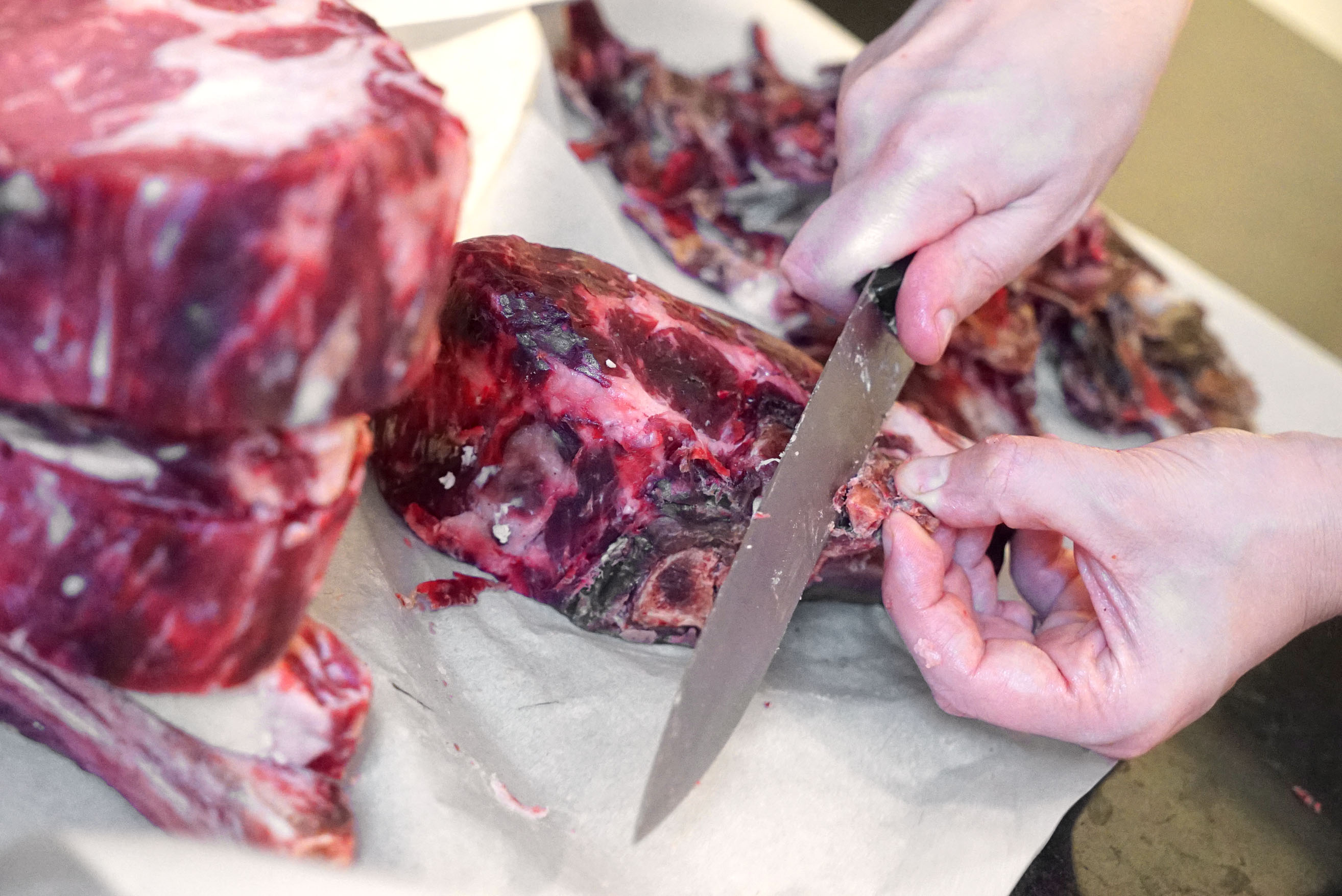 It’s an arduous task, but the end product is totally worth the effort. Here are some shots that my wife snapped of the slicing, trimming and portioning process.
