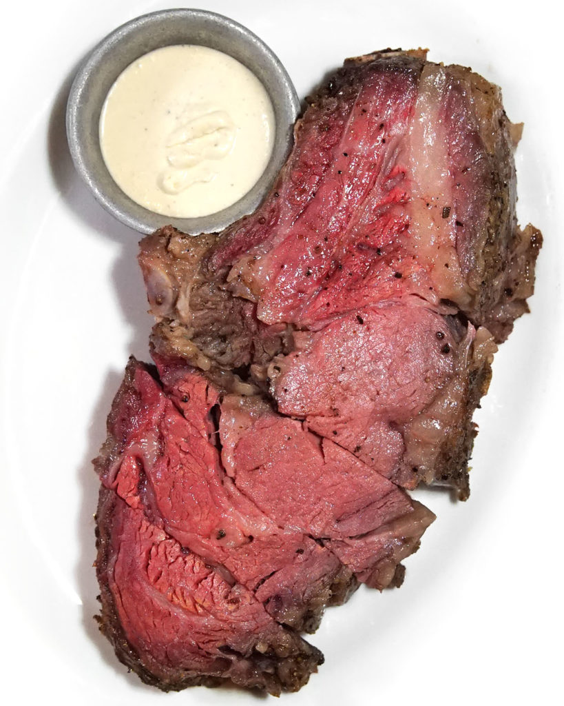 Huge cap on that (spinalis). And the meat was probably the most tender that I’ve ever had for prime rib, even in the more densely structured eye/center muscle (longissimus). It comes with au jus, horseradish cream, warm popovers and a spice rubbed rib bone.