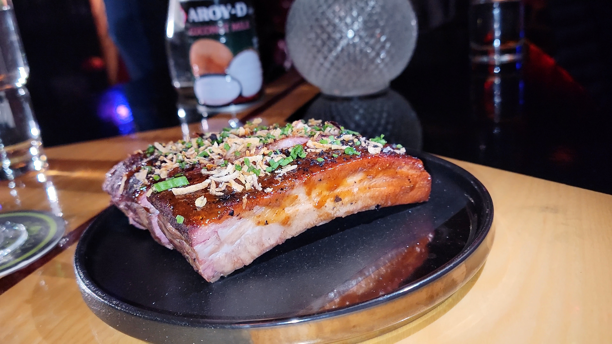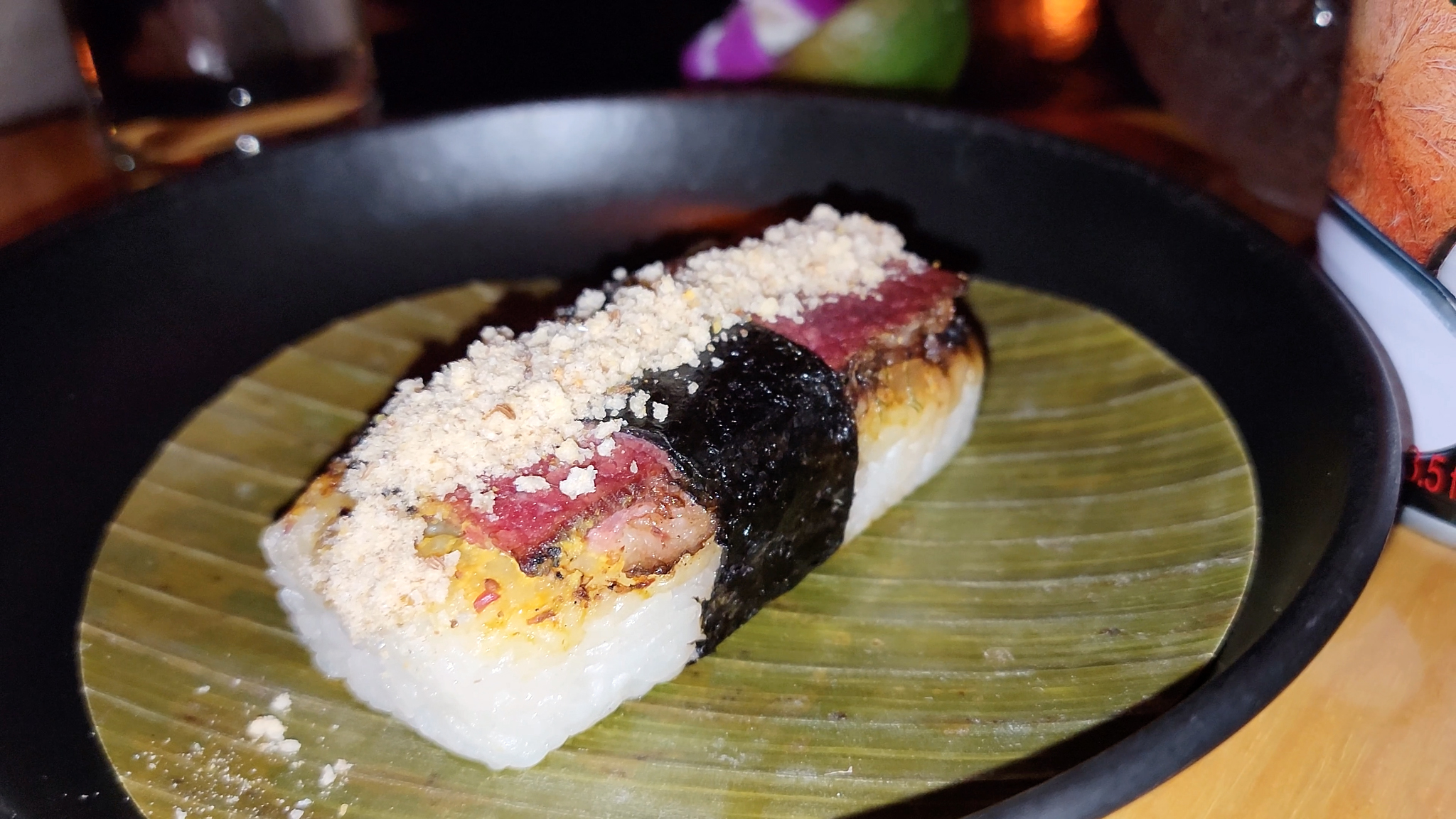 We tried the Holy Ground ribs, chicken thigh skewers, pastrami musubi and shrimp skewers. All were good, but the ribs stood out as the best, with the shrimp being the last in the lineup.