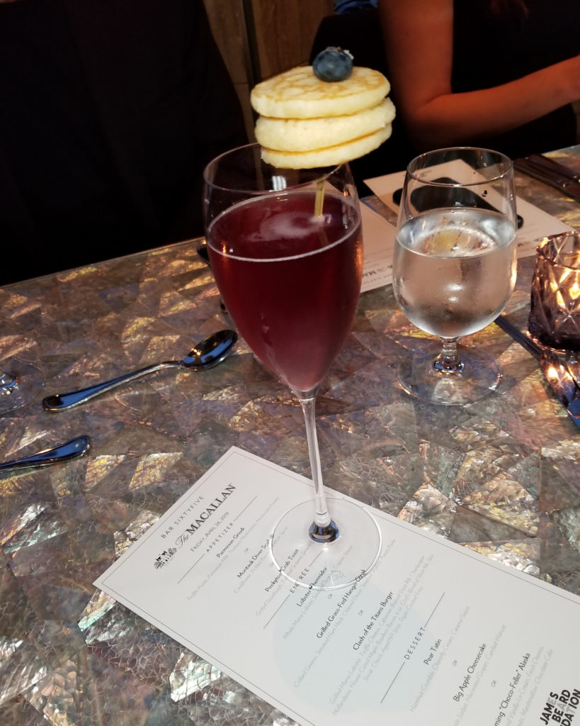 The meal started with this “Breakfast for Dinner” cocktail that had some bubbles, blueberry and, of course, Macallan scotch. The garnish was actually blueberries and pancakes. Kinda cool.
