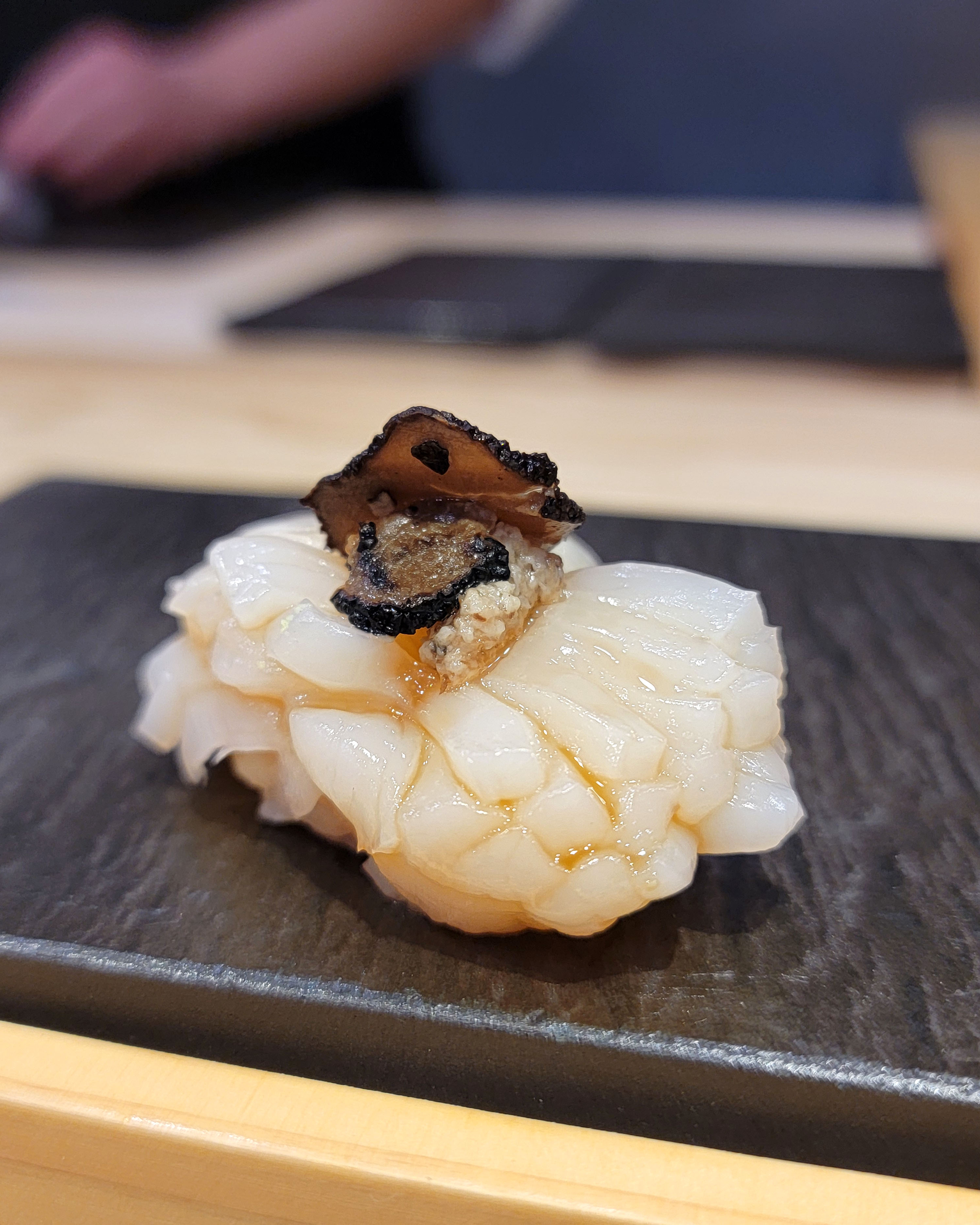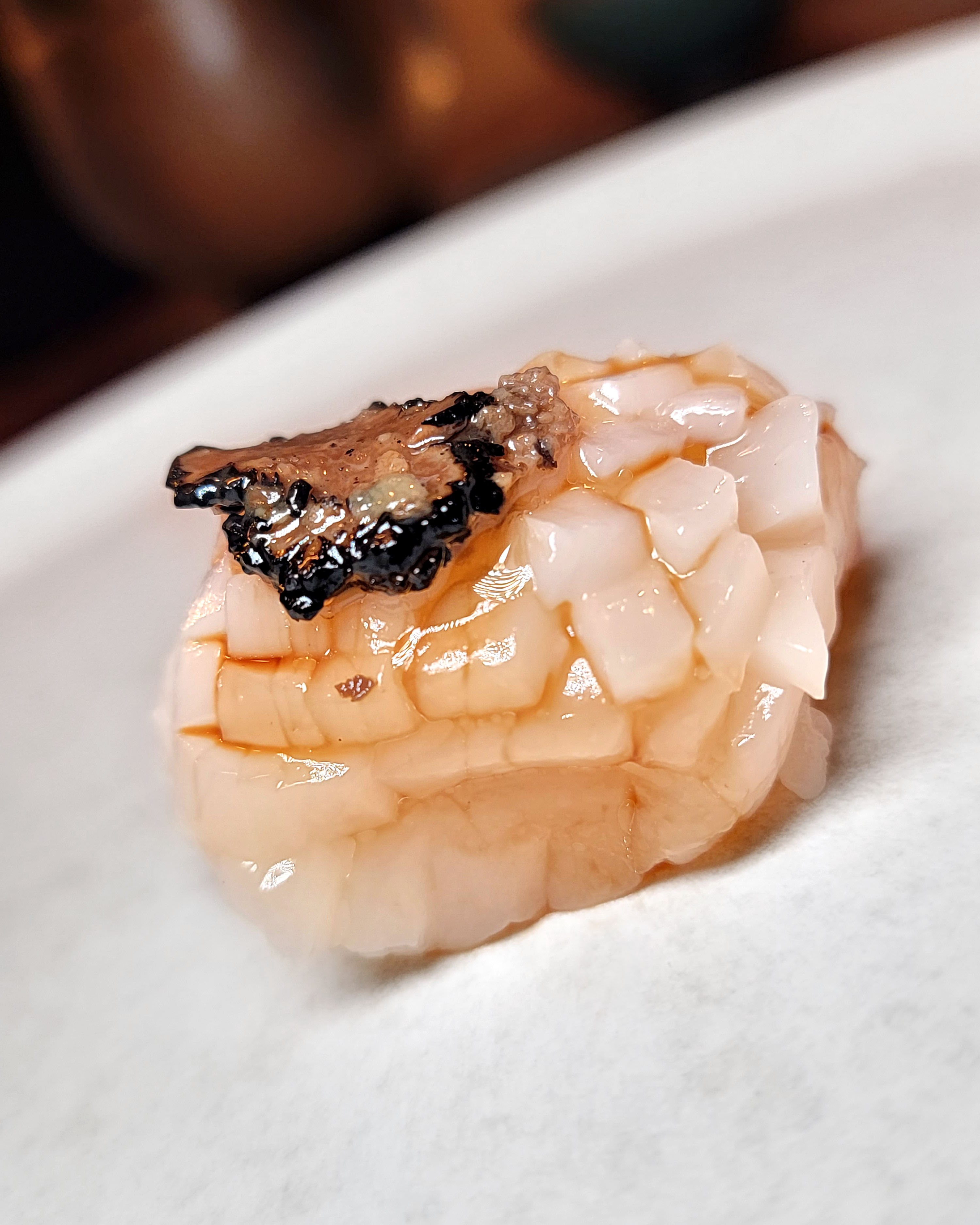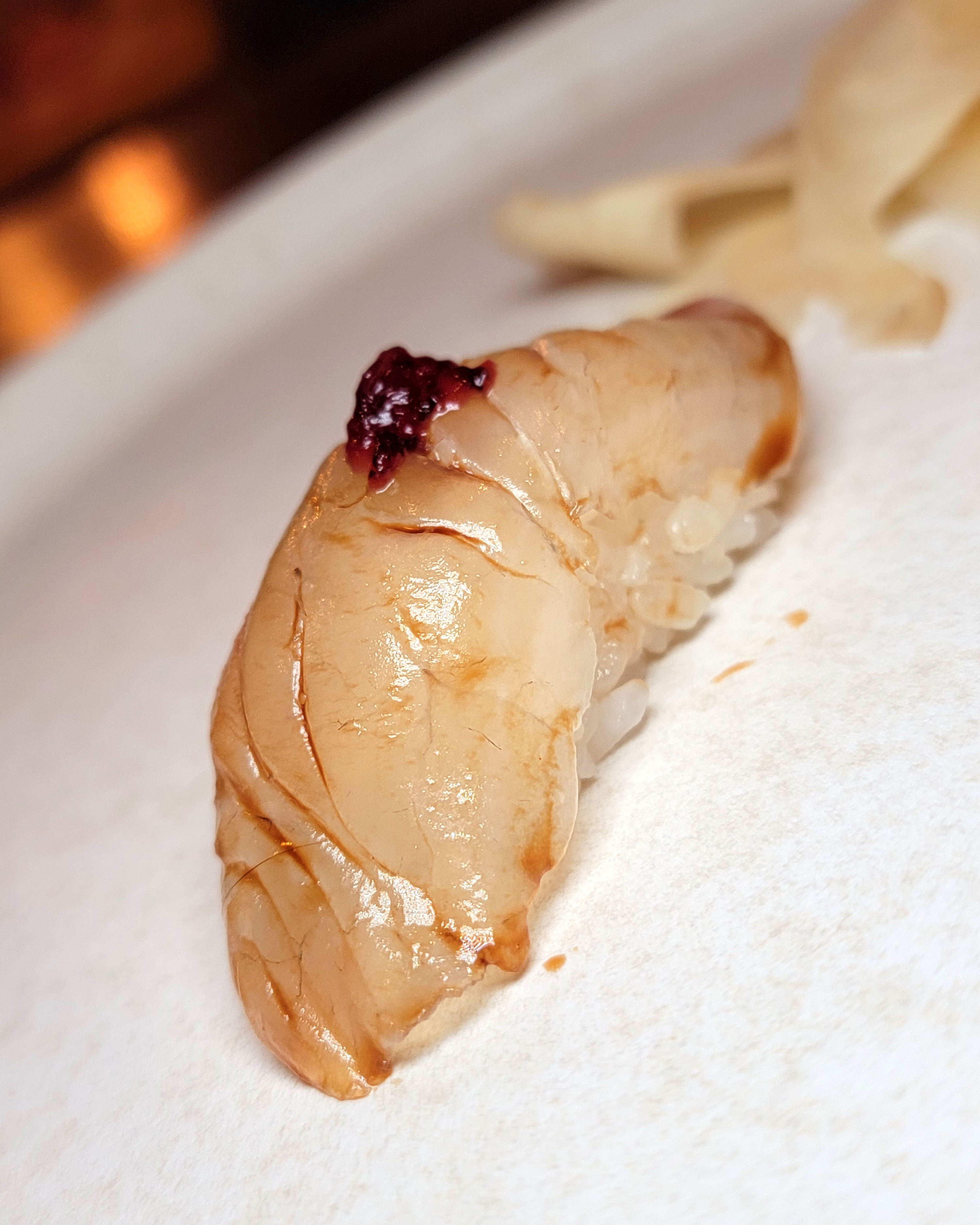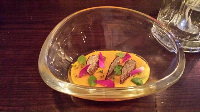 Here is the carrot puree with dashi gelee and summer truffle. At first I thought it was some kind of uni puree based on the color and bright, brine flavor. This was one of the most delicious items of the night. I think I sucked down three of these mutherfuckers.
