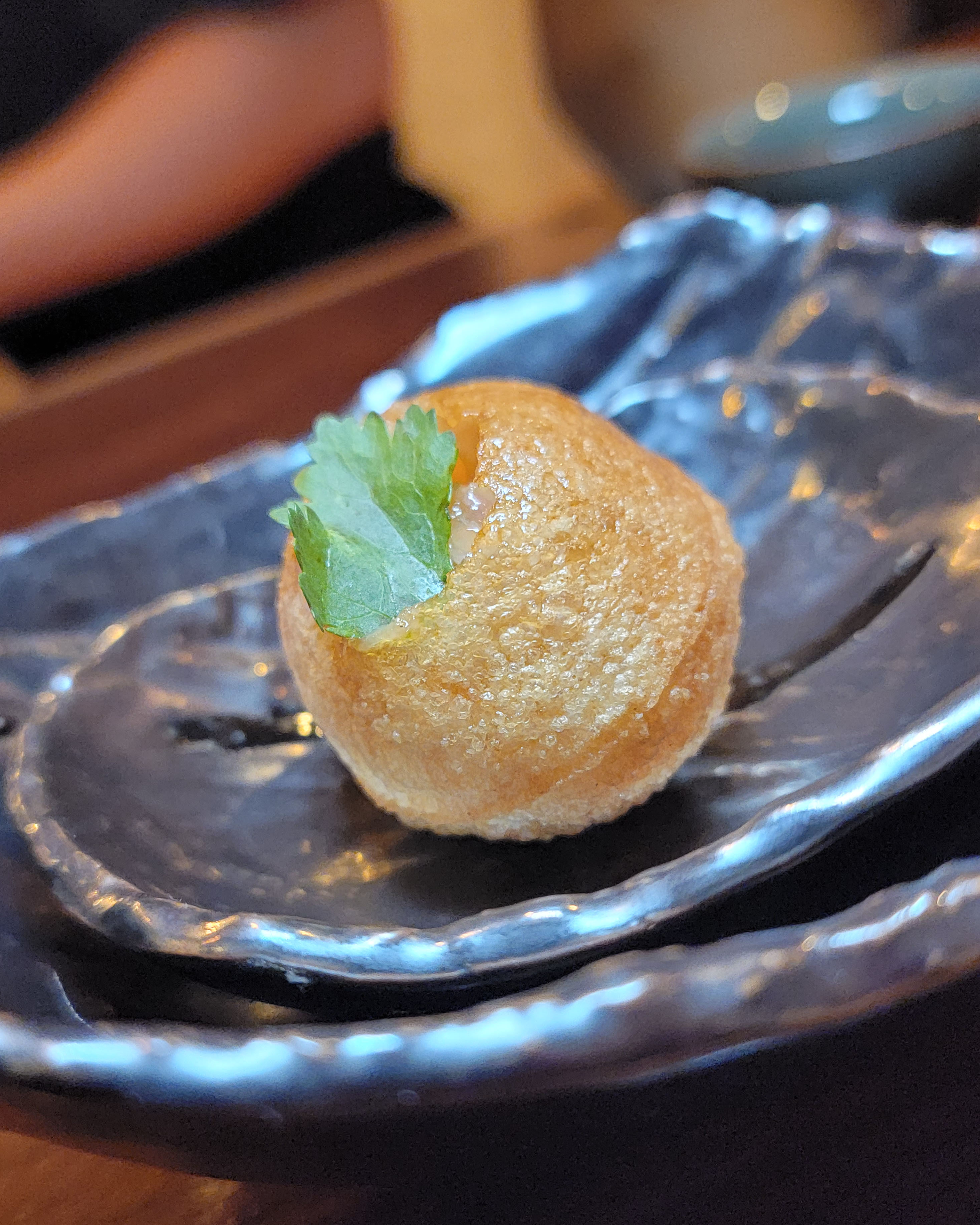 Lobster croquettes with lardo iberico and sansho peppers. I went back for seconds here. Just a great, soft yet powerful punch of velvety flavor inside that crispy fried outer shell. And sitting on a little puree of potato.