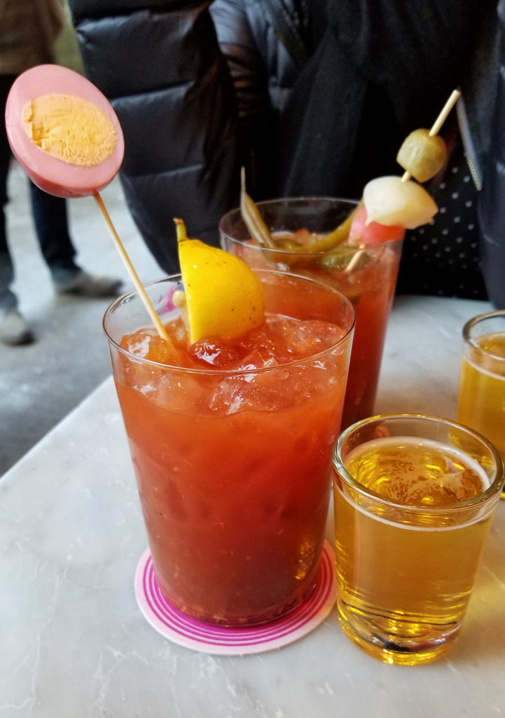 Mine was made with gin and garnished with a pickled egg, and my wife got a vodka based one with some southern spices, caper berries and pickled beans. I actually mixed my beer into the bloody when I was about halfway done, to make what was almost like a michelada.