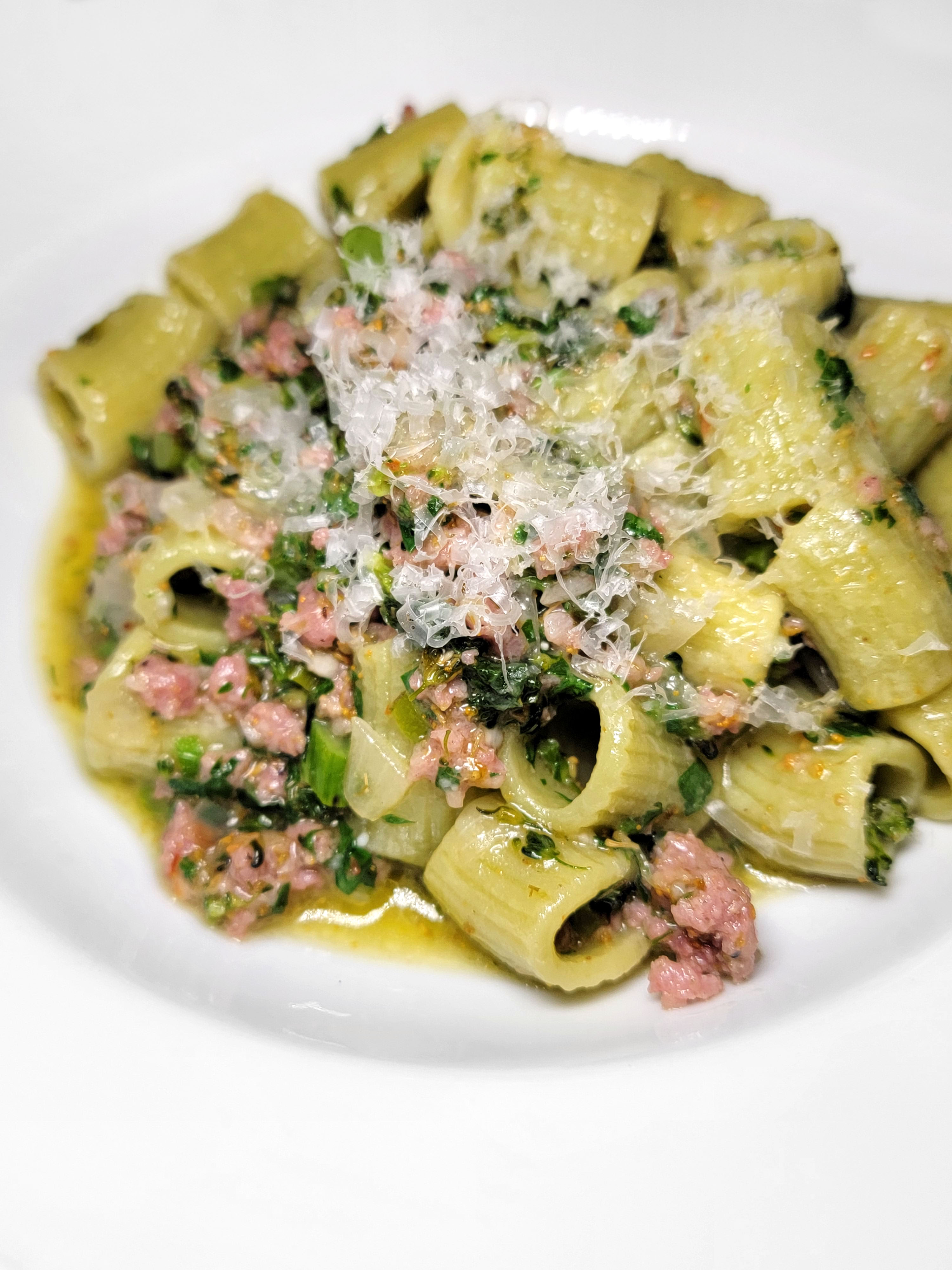 The first pasta was a garganelli-like macccheroni with duck ragu. This was absolutely delicious. Just the right amount of salt, al dente pasta, and a really hearty sauce with properly cooked duck meat well-dispersed throughout.