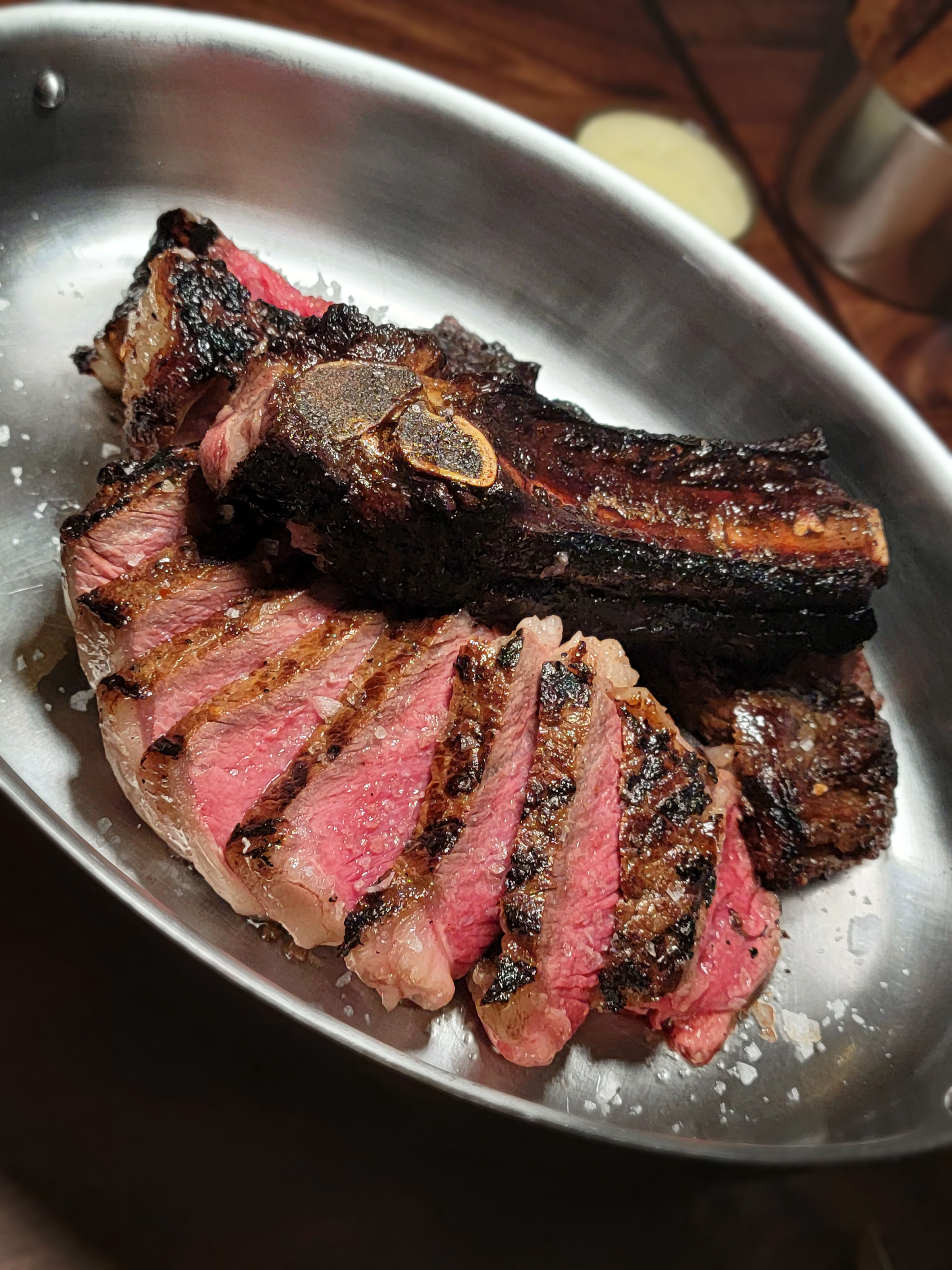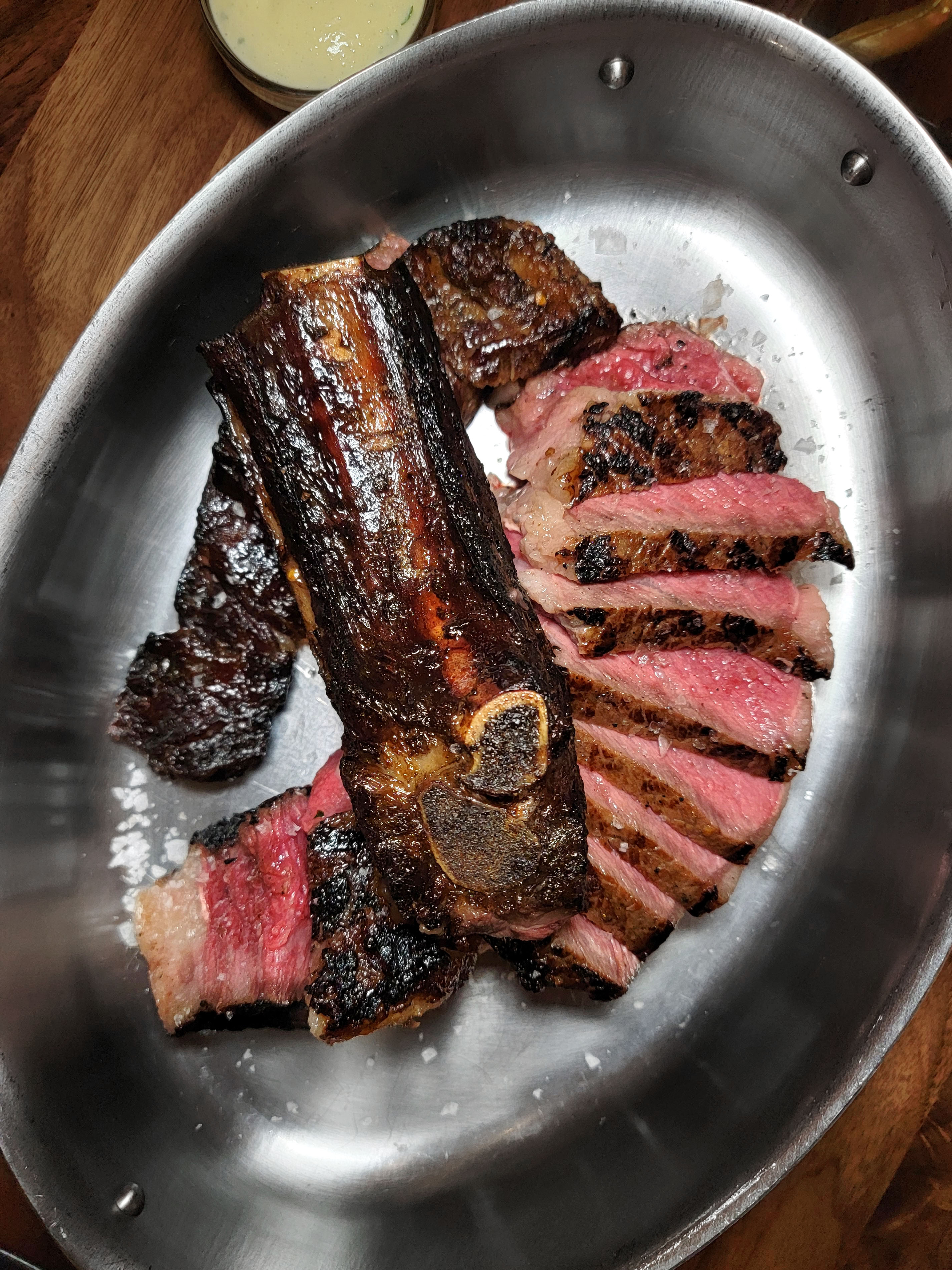 Okay so what makes it uniquely “Modenese?” On the bone there is a “Modenese Pesto,” which consists of pork lard, rosemary and spices. It was like sausage butter. Adding a smear of that on a bite of steak here and there made for a real treat. But the meat itself was rubbed with dried mushroom before cooking to give it a uniquely earthy crust. I also detected a hint of finishing balsamic on there as well, as I understand it is common in Modena to eat cooked steak with balsamic (I usually just use it on cold or raw meat salad type dishes). The only spots that had any real dry-aged flavor (a definitively different taste than the mushroomy crust) was along the bone, where less of the pellicle must have been trimmed away during butchery. In any case, that balsamic cut the fat nicely, and the mushroomy crust offered a very unique “steaking” experience on a perfectly cooked and tender cut of beef. 9/10.