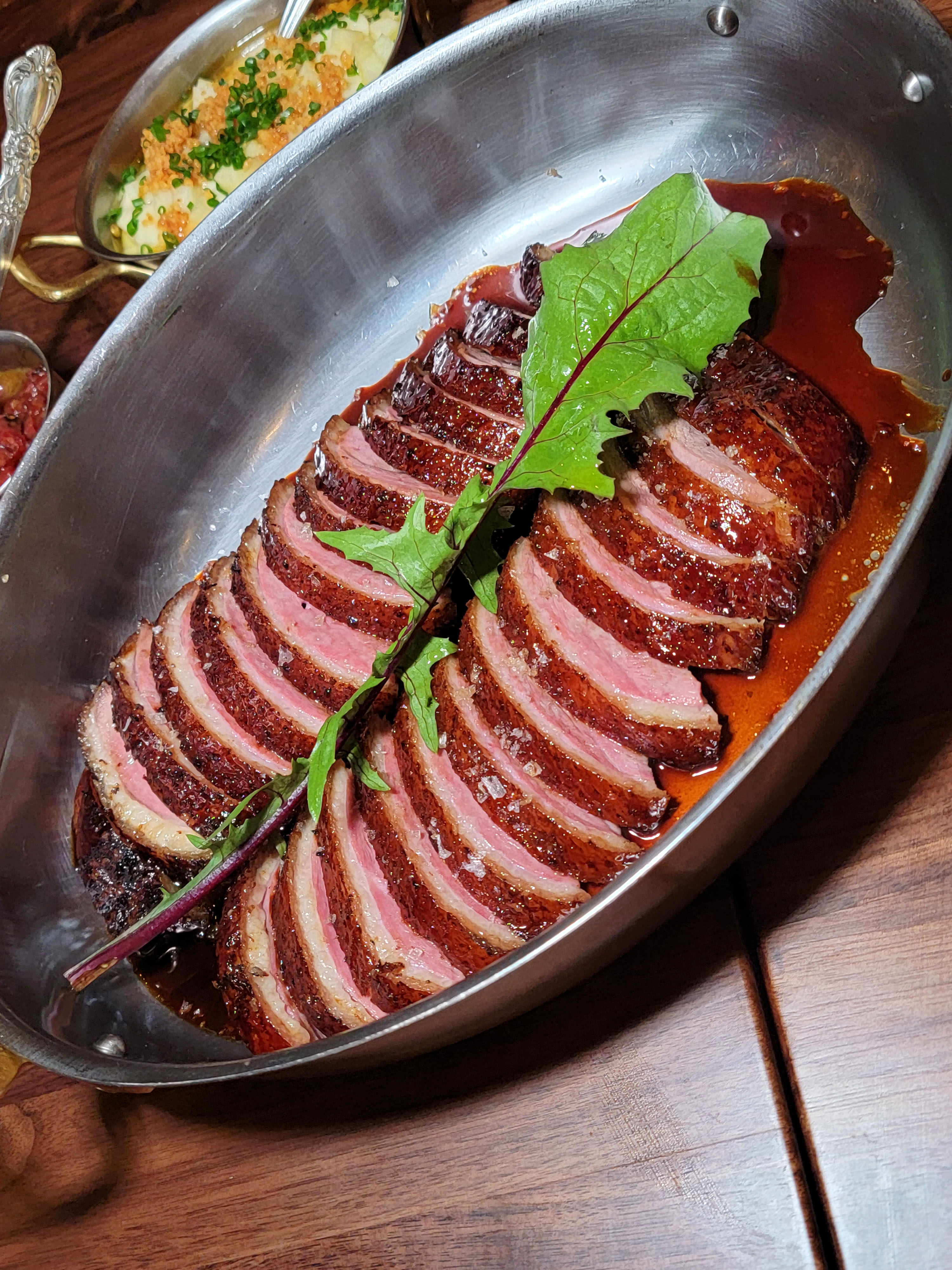For the mains, we ordered two entrees for two: the rib steak and the dry aged duck crown.