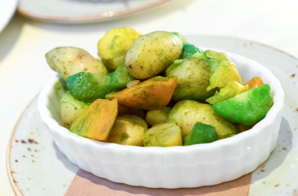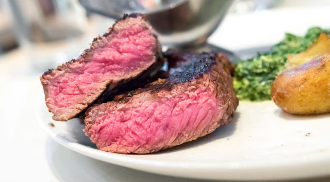At first I thought maybe it was a tri-tip based on the shape, but the muscle striations seem to go the wrong direction for that. Based on the muscle fibers, I think this is in the sirloin family. Perhaps top butt/sirloin, or top sirloin. Either way it was perfectly cooked, had a great crust, and was artfully topped with a maitre’d butter and herbs. At $69 this is also a great deal for people to try the best of what can be on an otherwise under-utilized cut. 8/10.