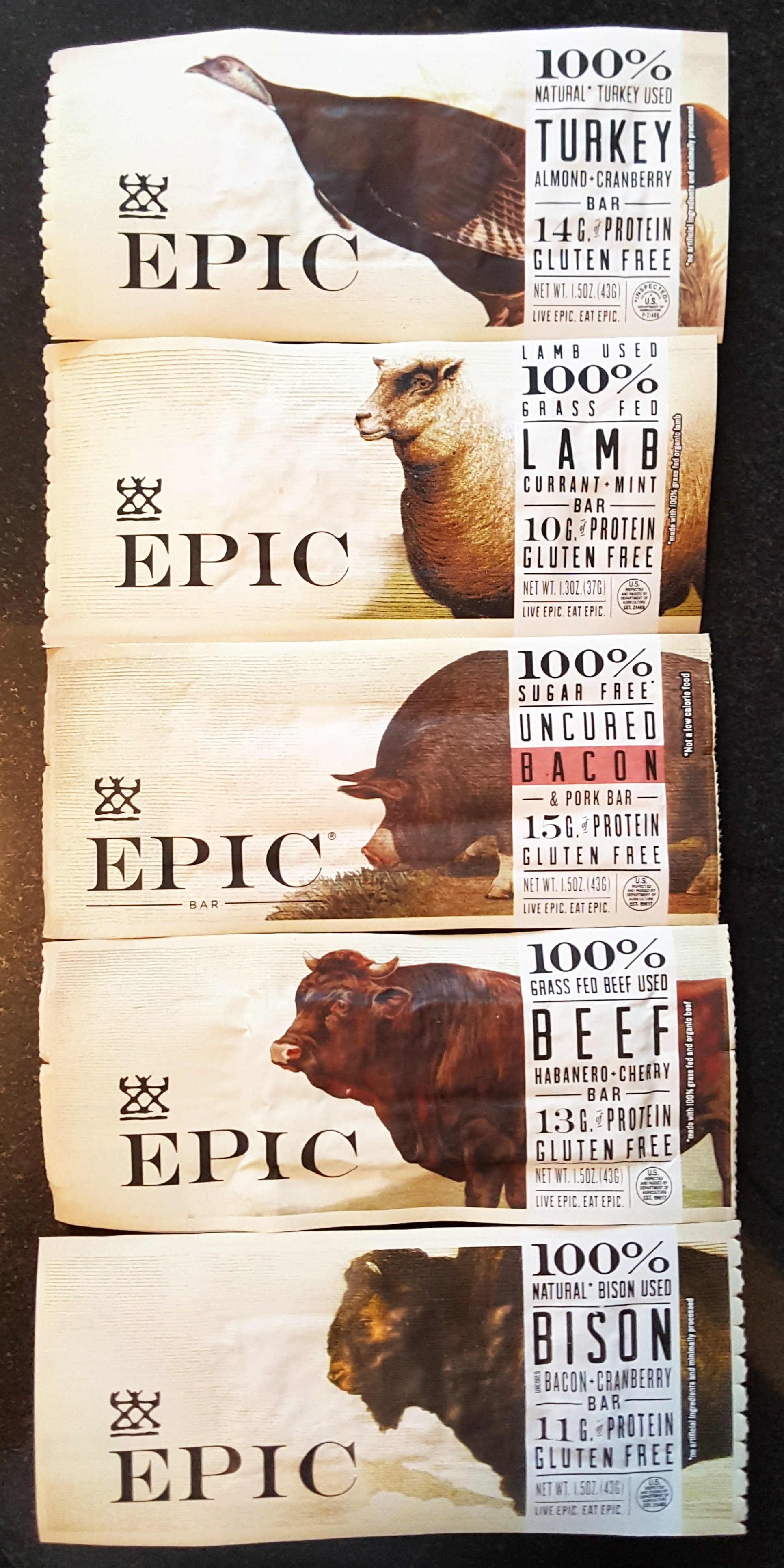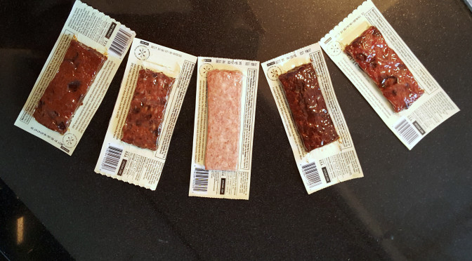 My wife’s uncle told me about these snack bars near the checkout at Whole Foods, so I picked up one of each flavor that I could find: turkey with almond and cherry; lamb with currant and mint; uncured bacon and pork; beef with habanero and cherry; and bison with bacon and cranberry.