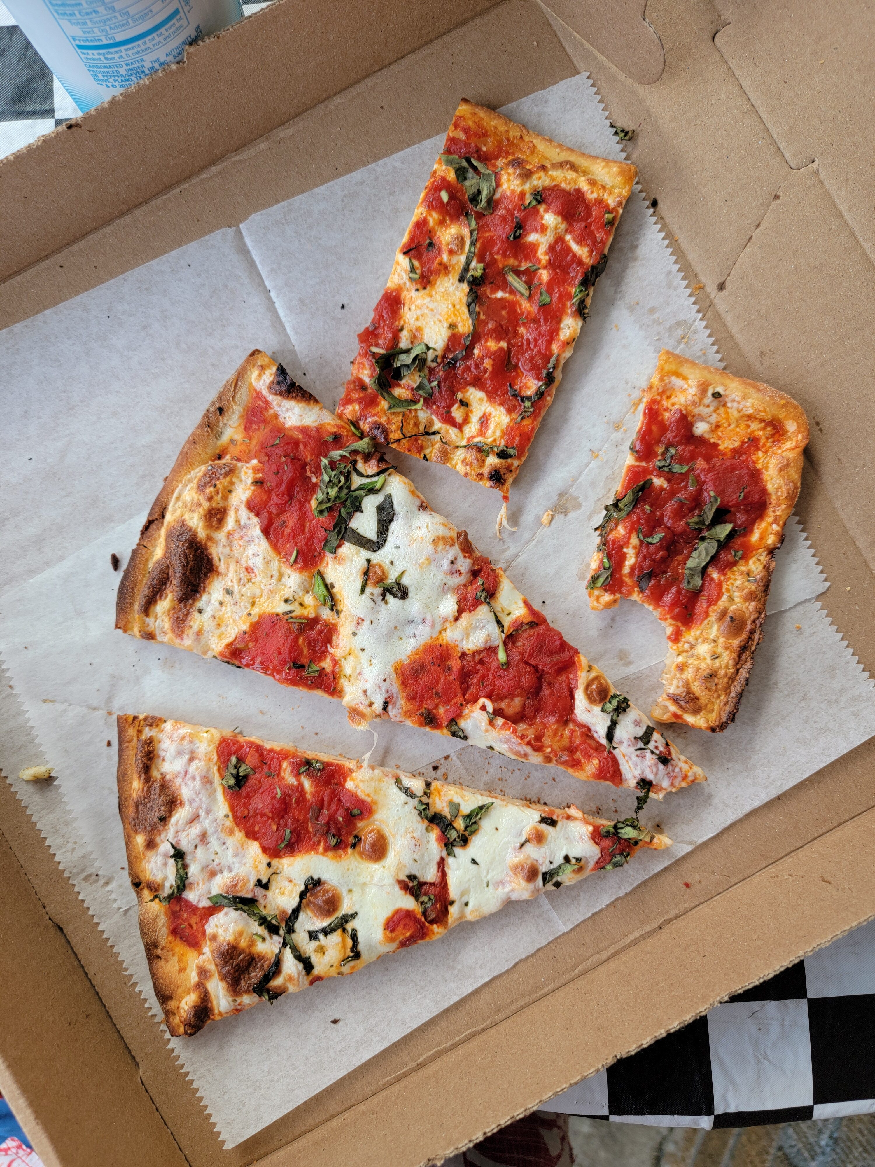 I ordered a margarita slice and a grandma slice, and I had the guy warm them slightly and slice for me, so I could shovel them down my throat faster without getting shit in my beard.