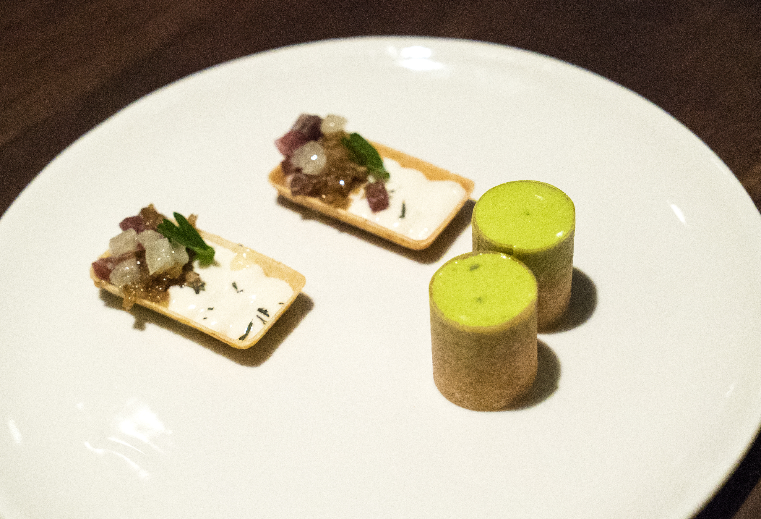 The first food items were a lobster & mint cylinder, and a dry aged beef tartlet with carrot. The beef was really flavorful and savory. I wanted more! The lobster and mint combo was surprisingly good, and it was a refreshing bite.