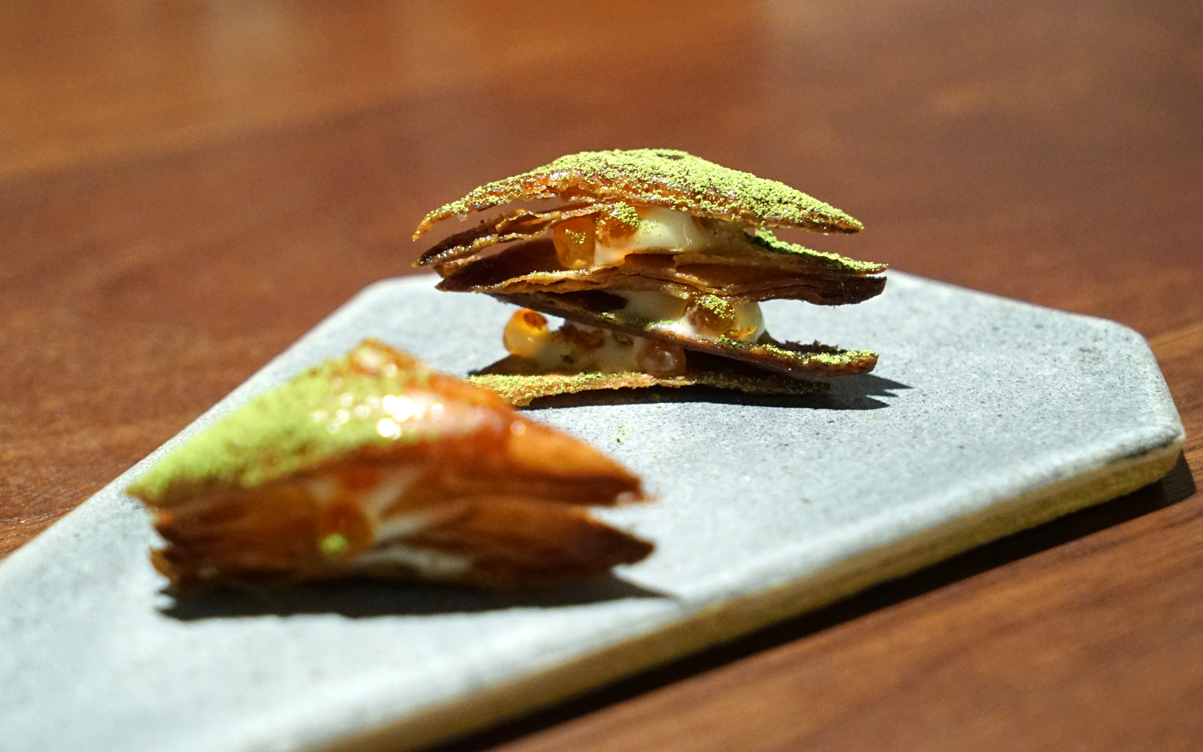 Then came a millefeuille of rye phyllo dough layered with trout roe and green tea powder. Absolutely stunning to look at, and even nicer to shove down your throat. Just be careful not to breathe while eating or that green tea powered may have you coughing.