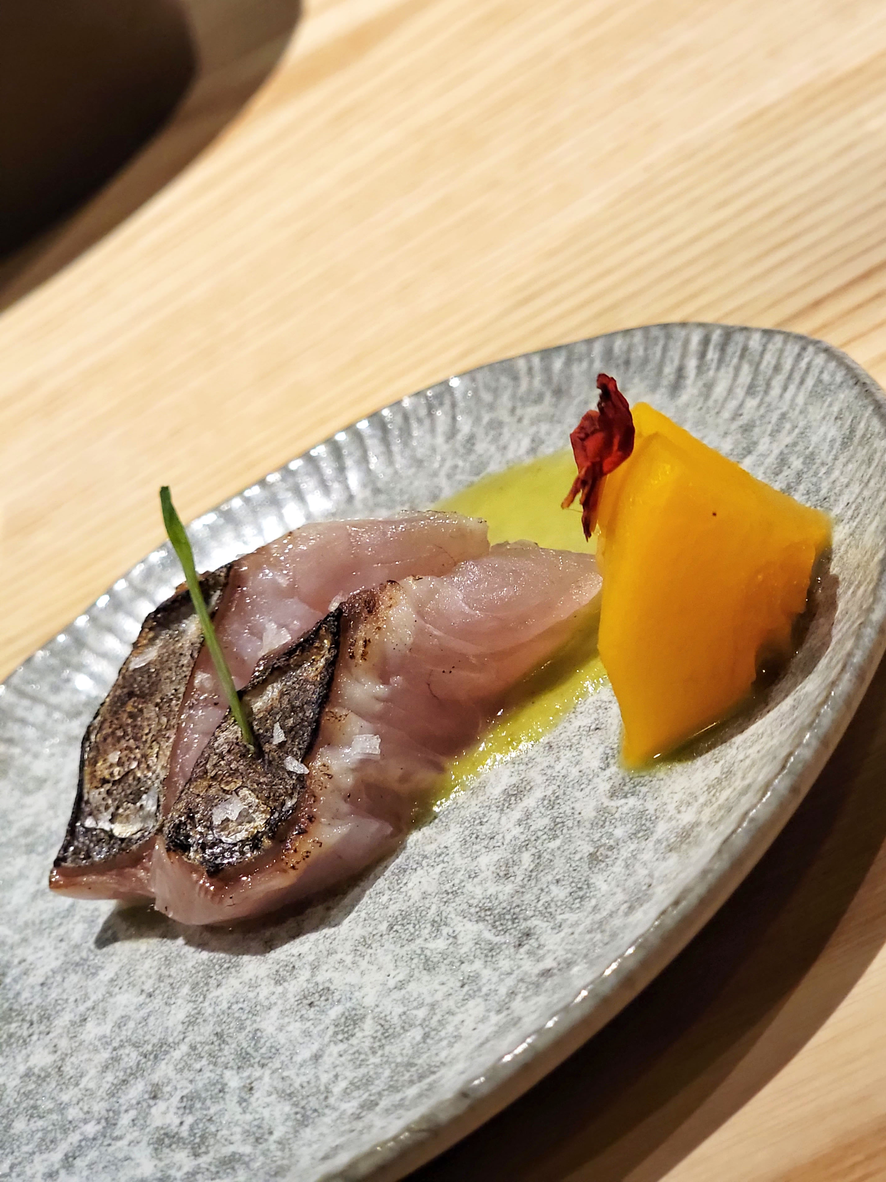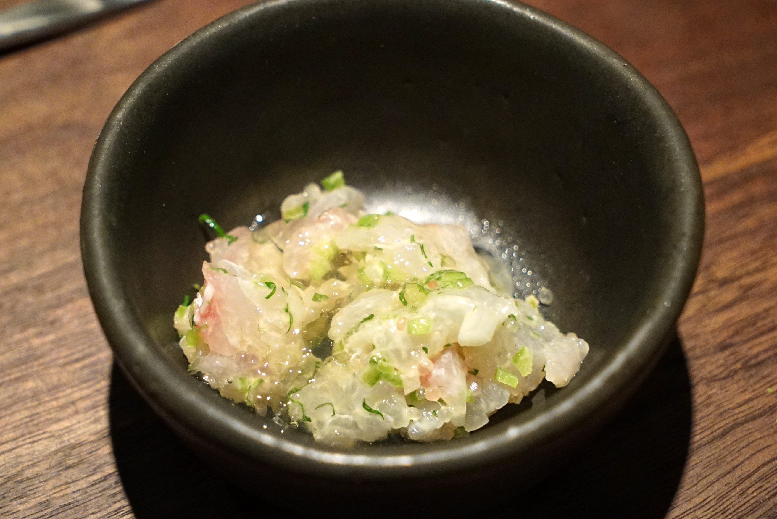 Red snapper sashimi: this was really delicate and clean, and it went perfectly with the shio-bonito ponzu and wasabi salt, which were provided for dipping.
