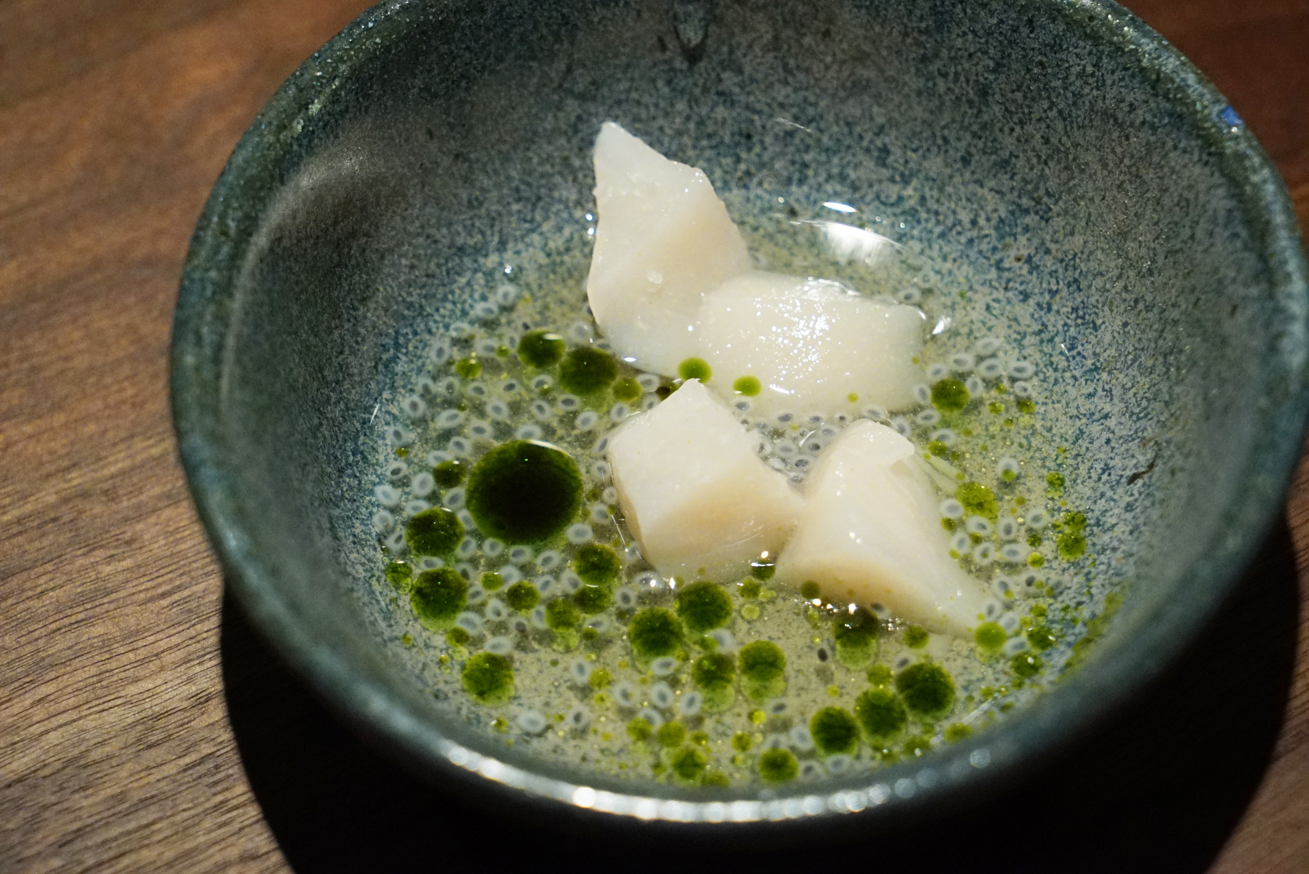 Hokkaido scallops: These were almost raw, and absolutely delicious. Just the outside was cooked from the closeness of the flesh to the hot oil. My favorite bite of the night.