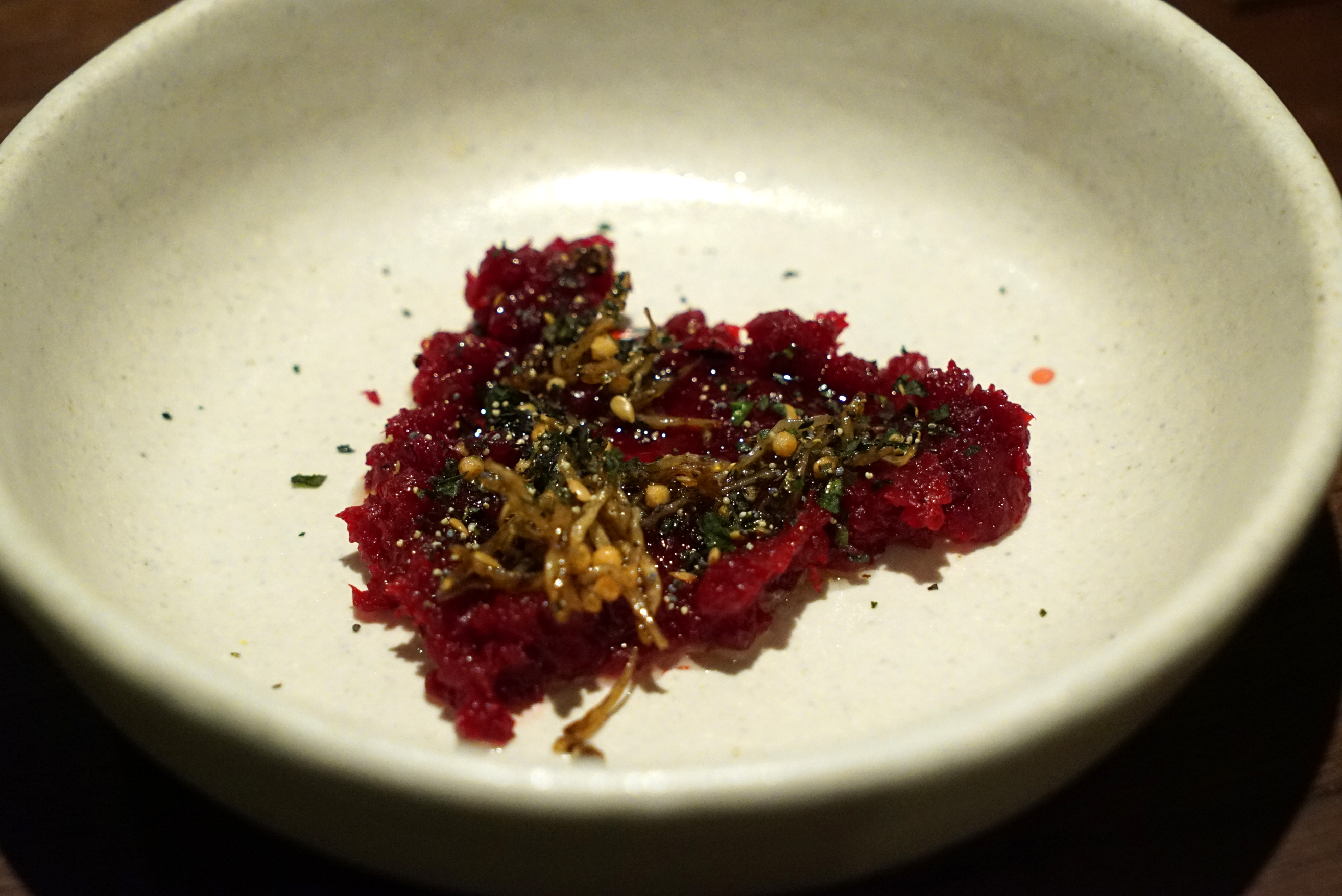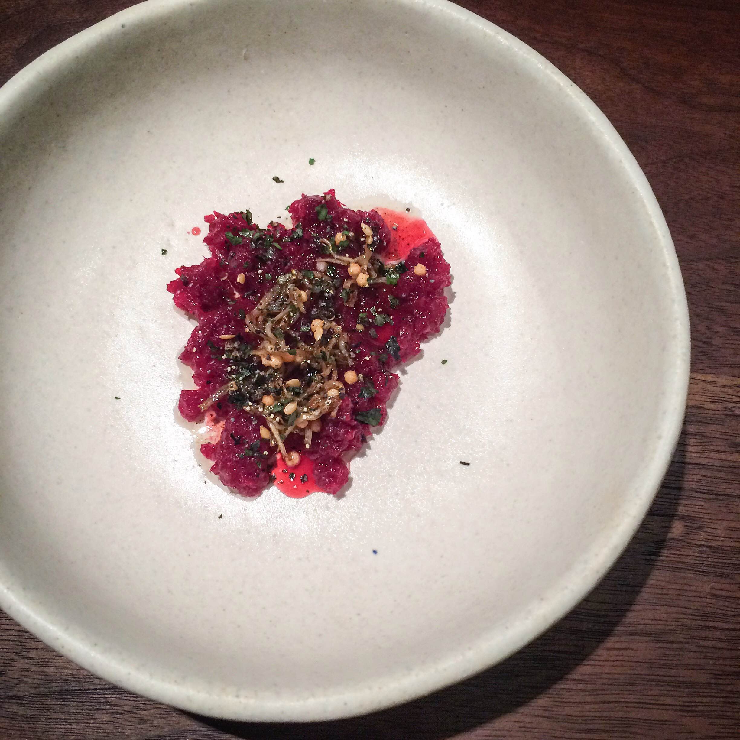 Next was probably my least favorite dish, but it was still nicely executed. Beets with brown butter and bonito (dried anchovies).