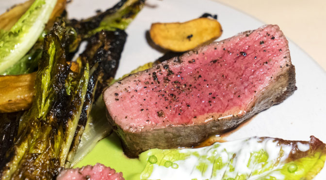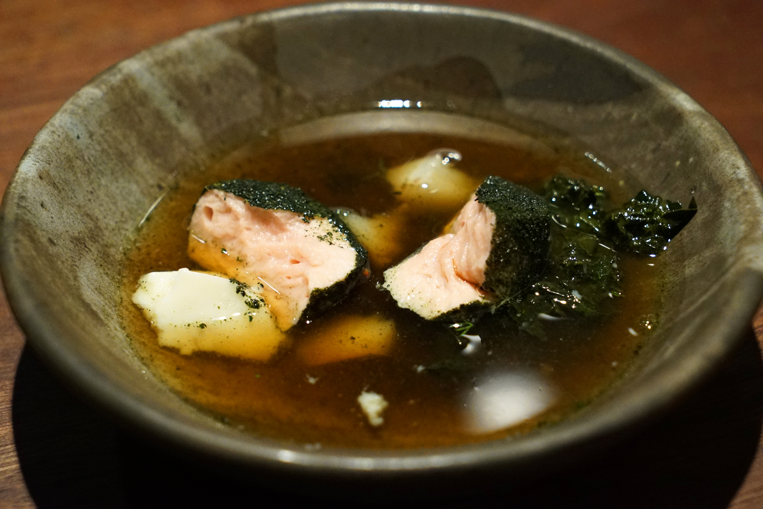 The trout mousse with pickled sunchoke and kale in a dashi broth was warm and comforting. A bowl of this on a cold winter night would hit the spot. They poured the broth in table side. I shot some video of it (six seconds), but it really wasn’t that exciting so I decided to just show the photo.