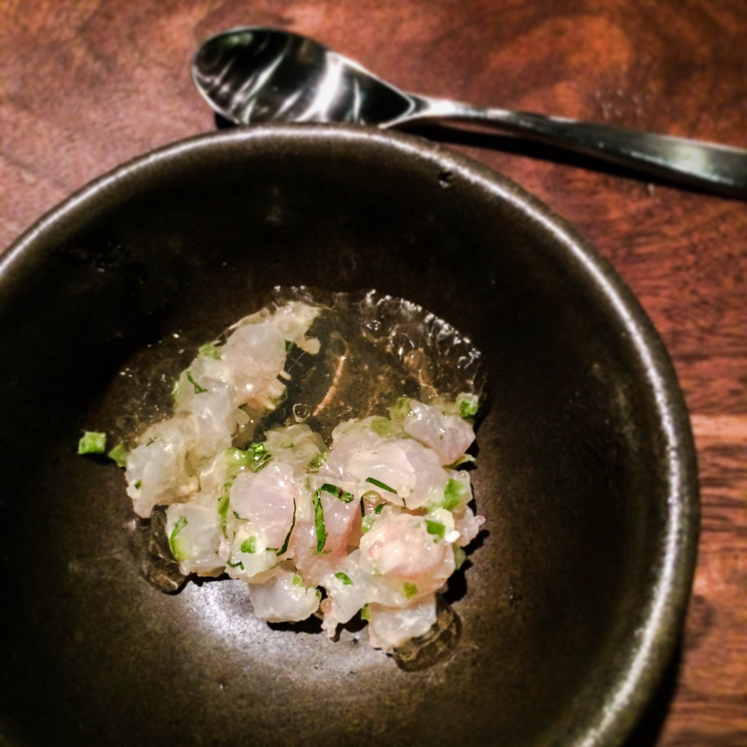This red snapper tartare may have been my favorite dish of the night. It came mixed with a jelly made from the fish bones broth/flavor, and dressed with yuzu, lime and shiso spray.