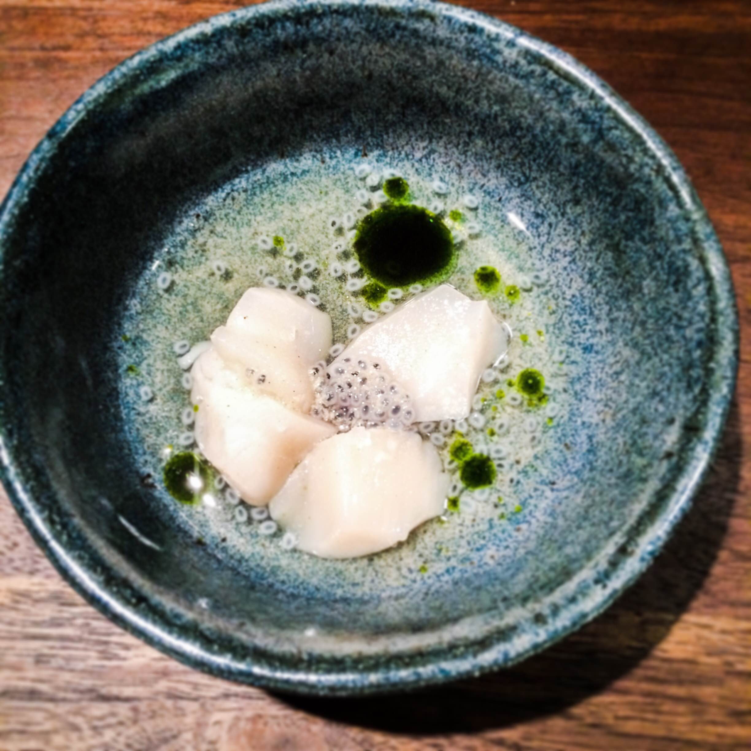 Another refreshing and light dish was this raw scallop with pineapple dashi, drizzled with basil seed and basil oil soup. Awesome.