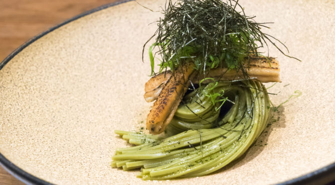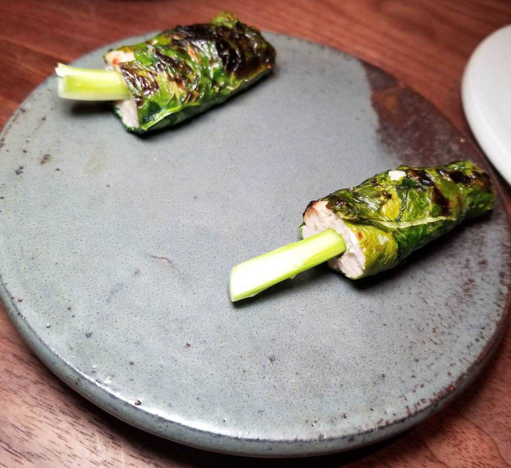 This next dish was fun to watch them prepare. It was torched mackerel with rice, wasabi and dash ponzu sauce, sitting on a wasabi leaf. Sushi, essentially. The cool thing was that they used an infrared torch to get that char on the fish without imparting any fuel flavor from something like a butane torch.