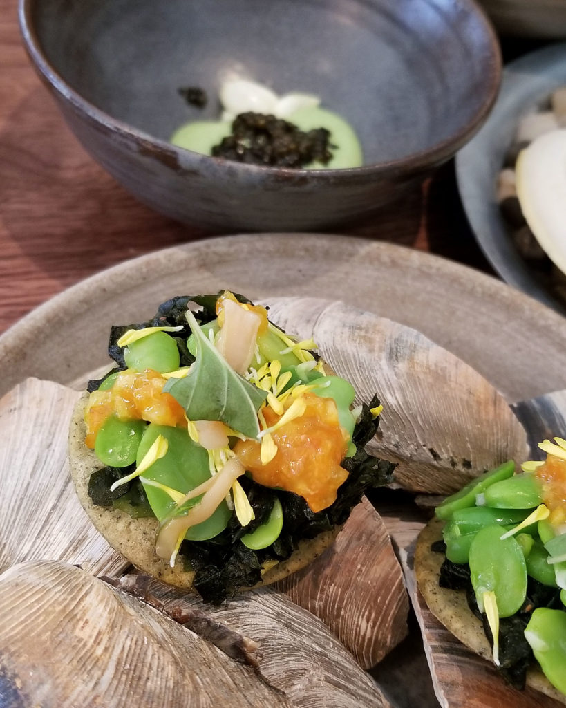 Nori crisp with clam, fava bean and preserved citrus.