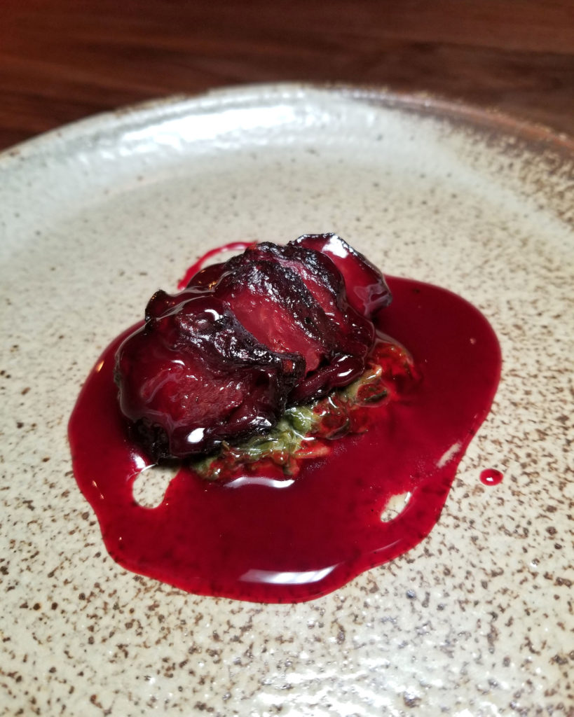 Course 4: Grilled Squid with Morels, Blackberry, and Hazelnut Mole