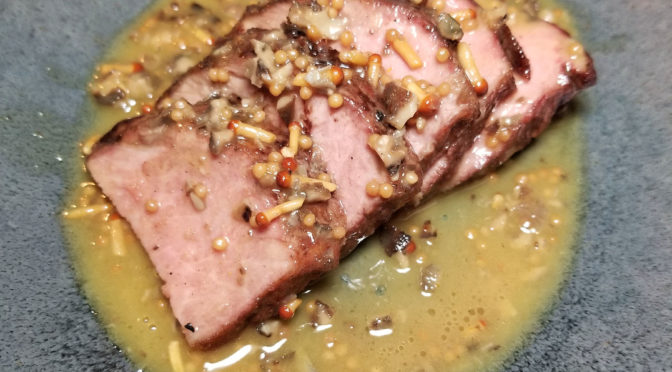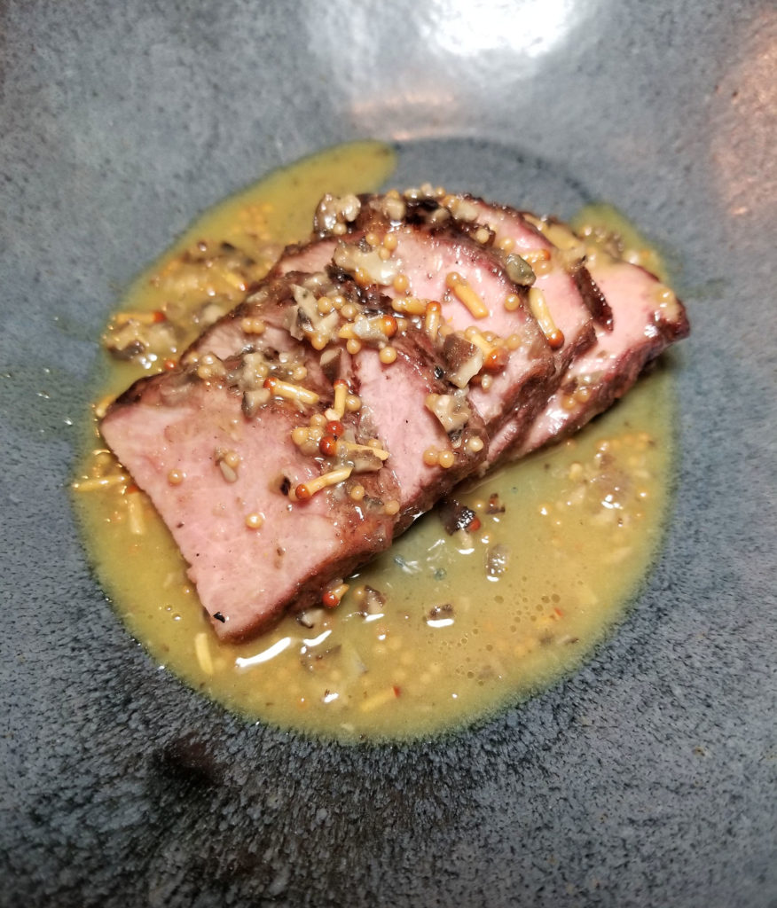 Pork neck with a sauce made from snails, mustard seed and smoked maple.