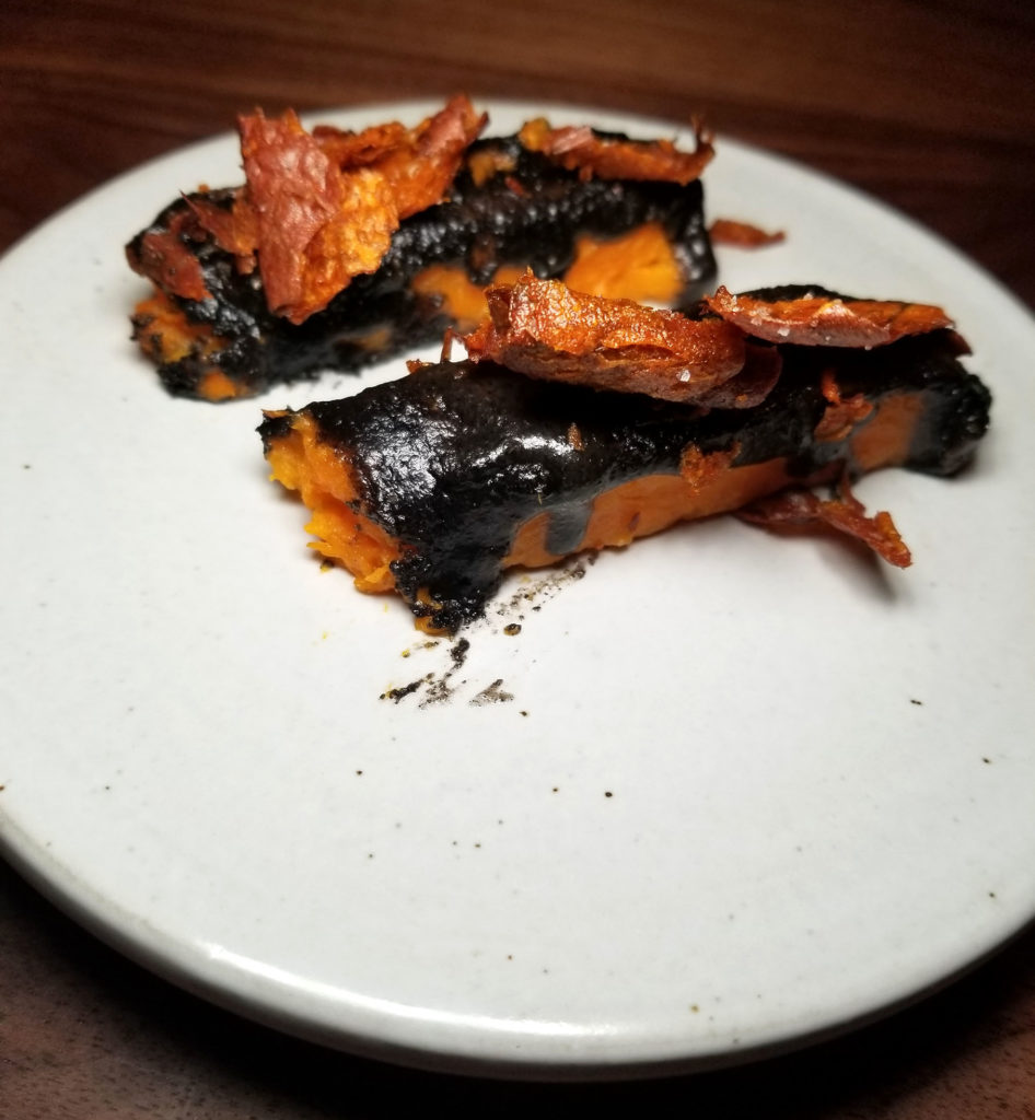 Roasted sweet potato logs with black sesame.