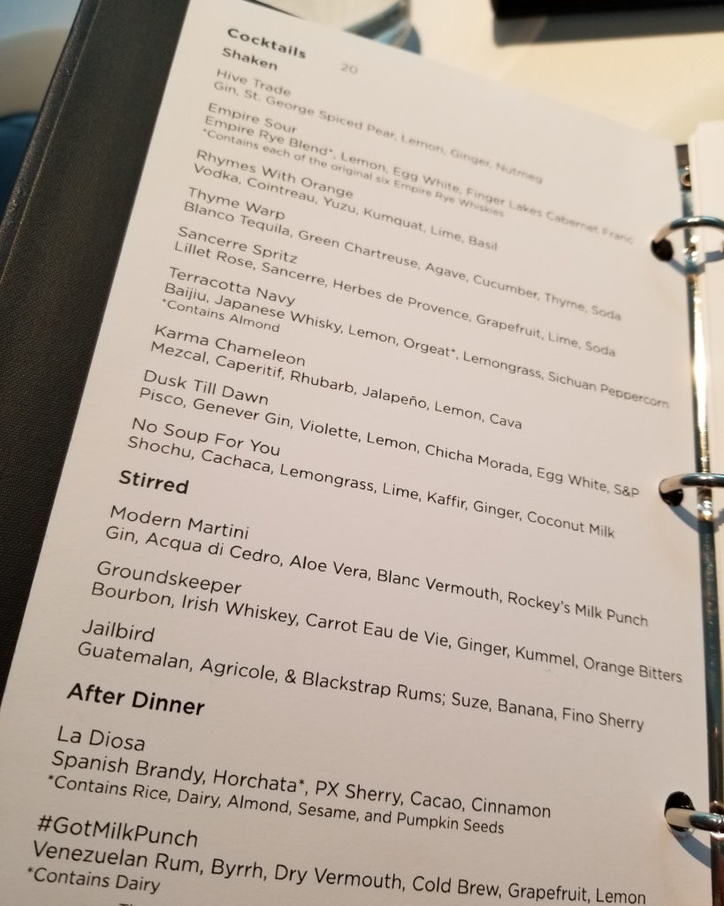 Everyone at the 6pm seating was given a glass of champagne upon entering, which I thought was cool. My wife and I opted out of the $100 drink pairing and decided to try three cocktails throughout the meal instead. They don’t have high proof liquor yet, but they do a good job making cocktails with wine, champagne and liqueurs. I think they also serve beer as well.