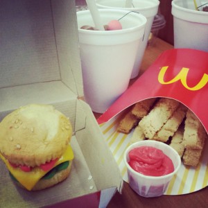 When I said medium rare inside I wasn’t fucking kidding. It’s strawberry cake, nice and pink all the way through, but it still maintains nice grill marks on top with a healthy sear (brown fondant with lines made from food coloring):