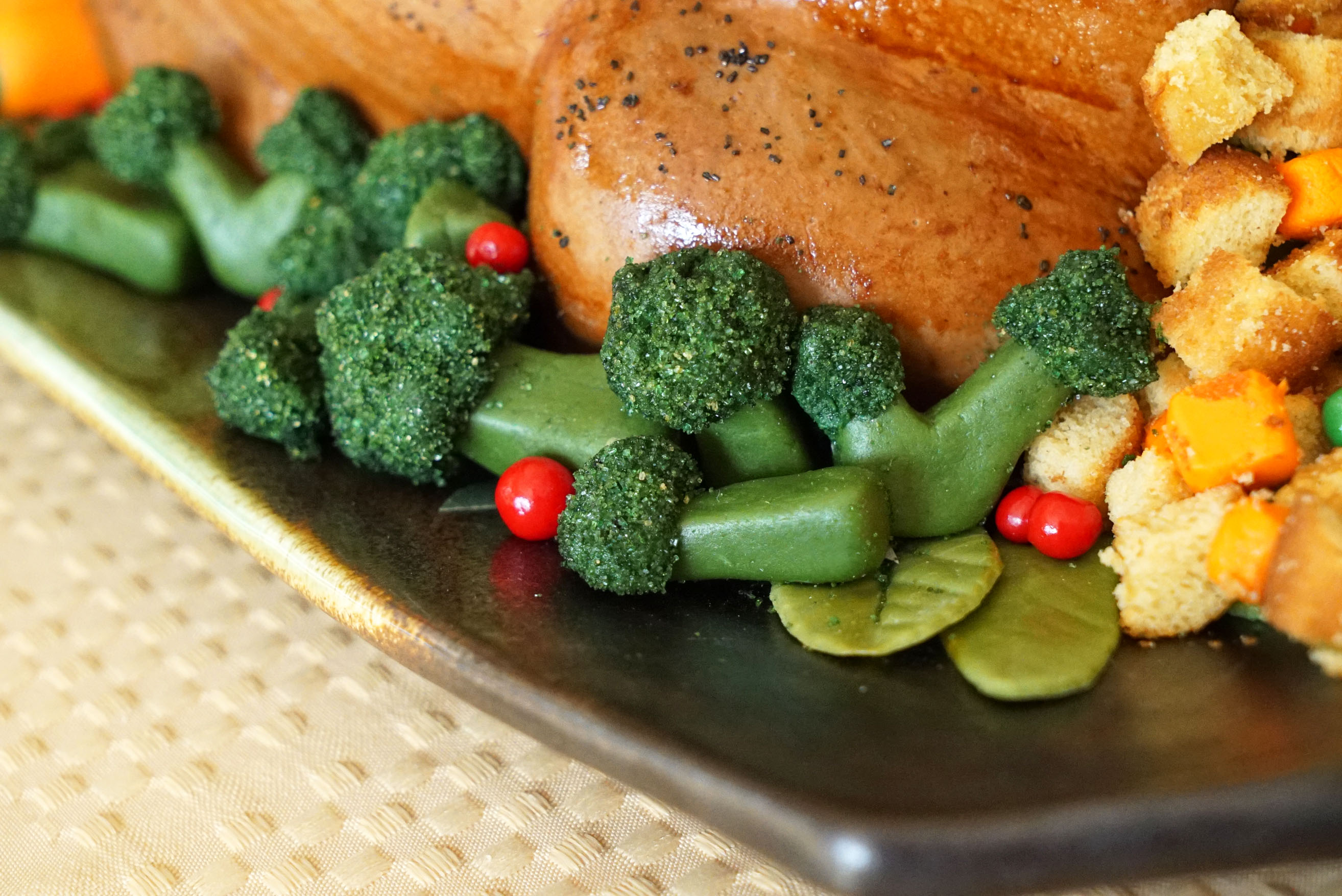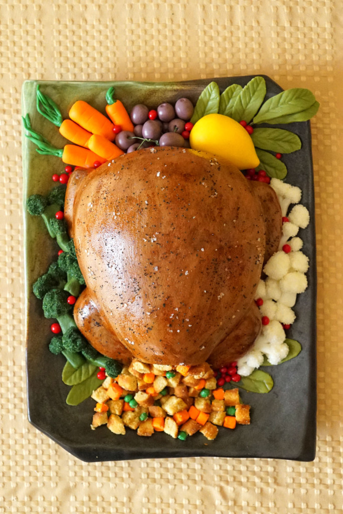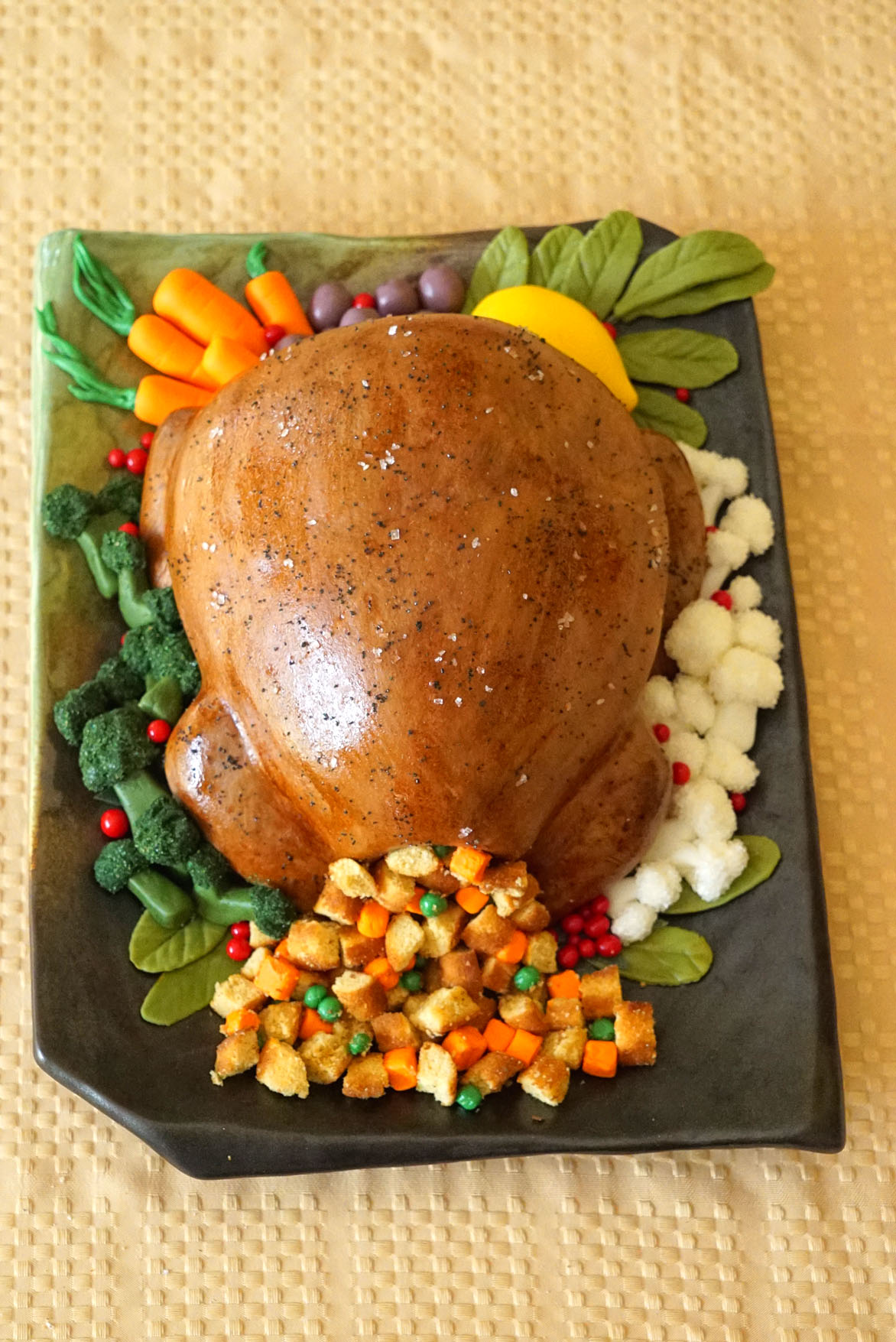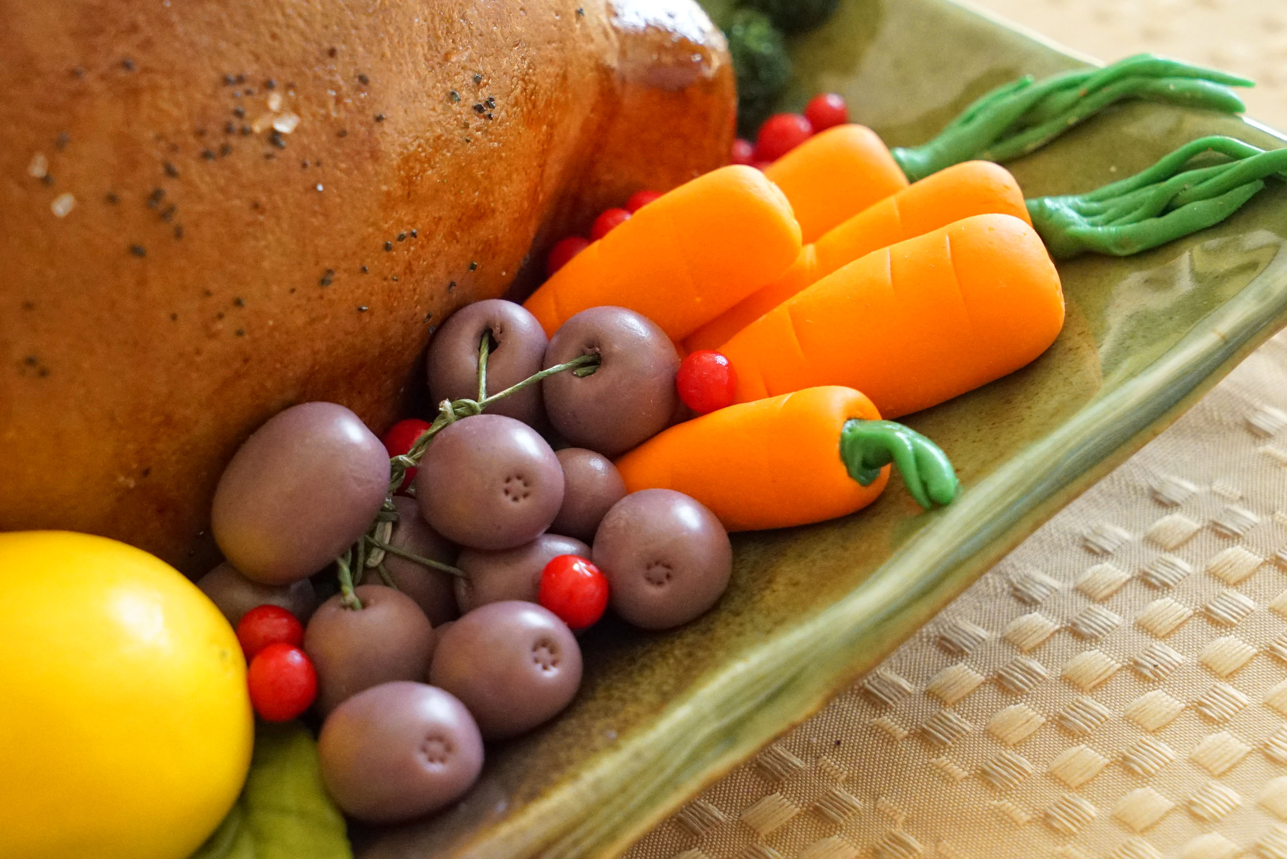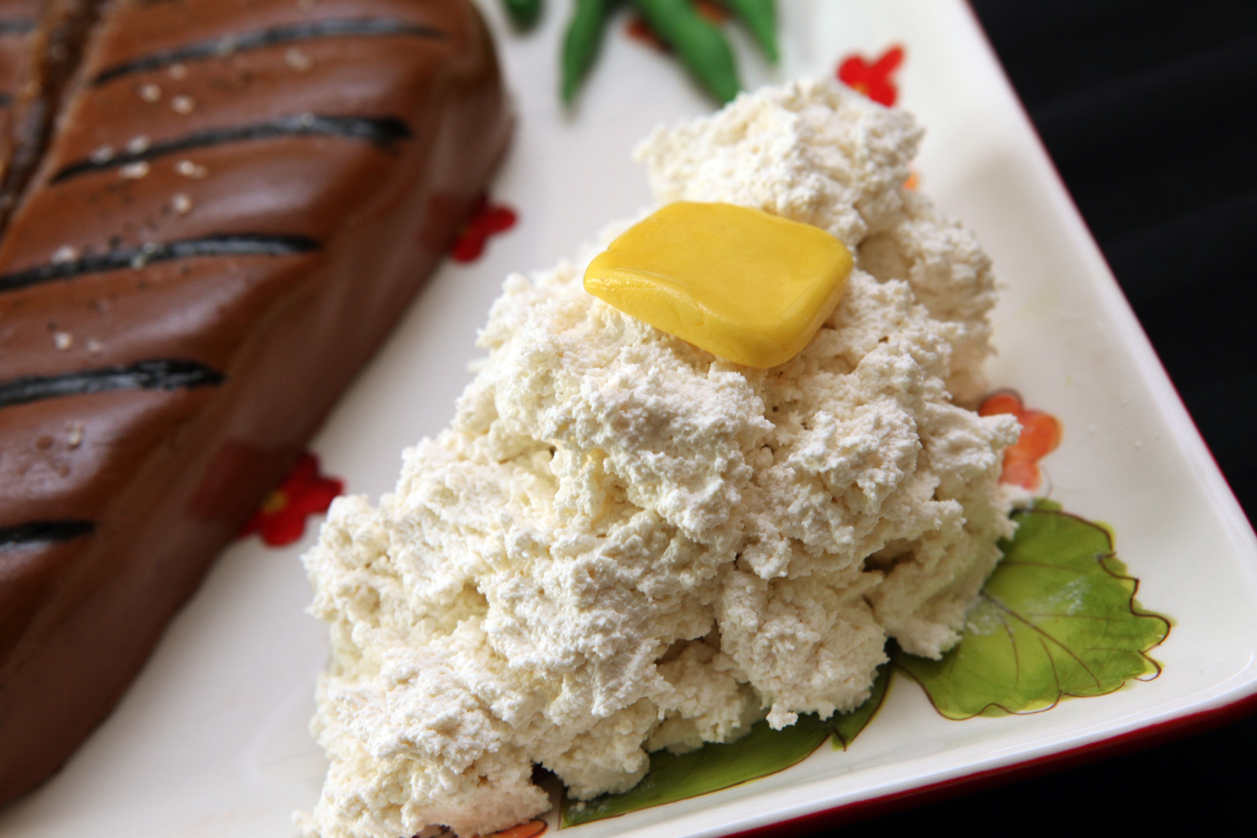 The mashed potatoes are made from mashed up vanilla cake mixed with vanilla frosting, and topped with a slightly melted-looking yellow square of fondant as the butter: