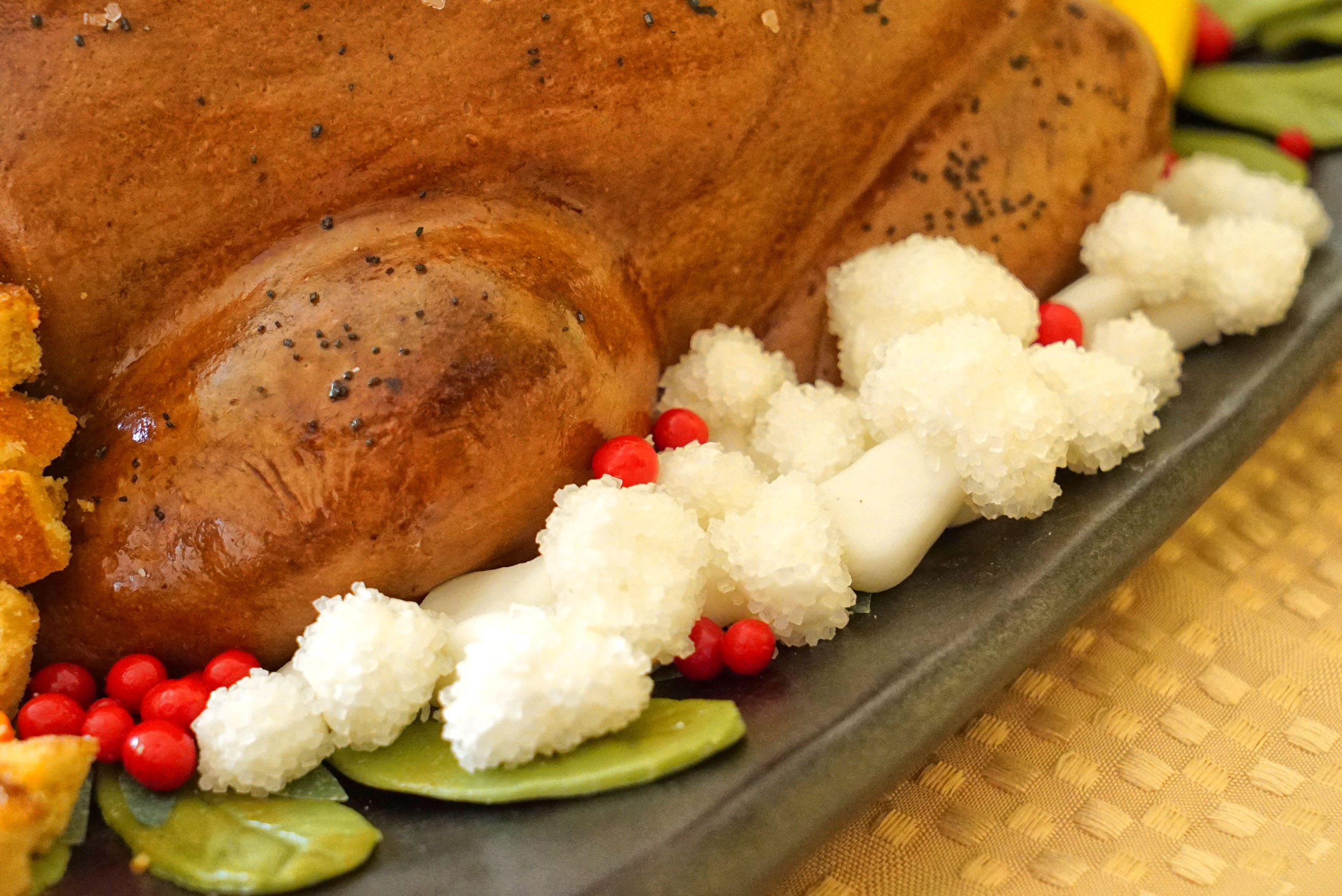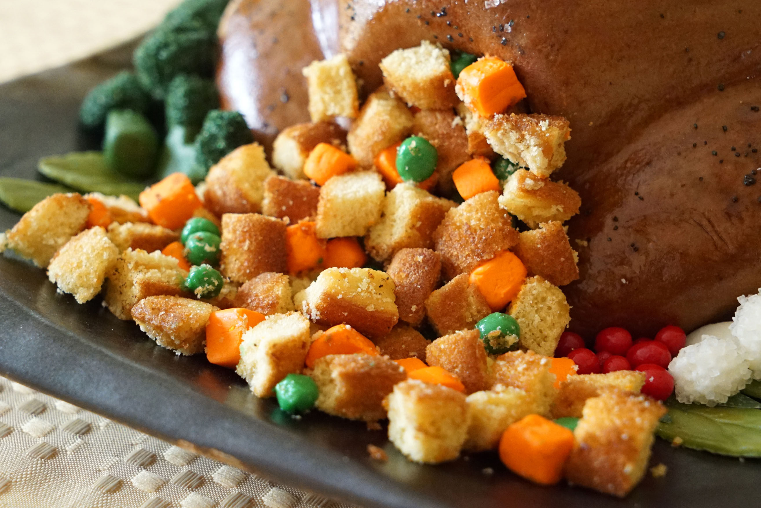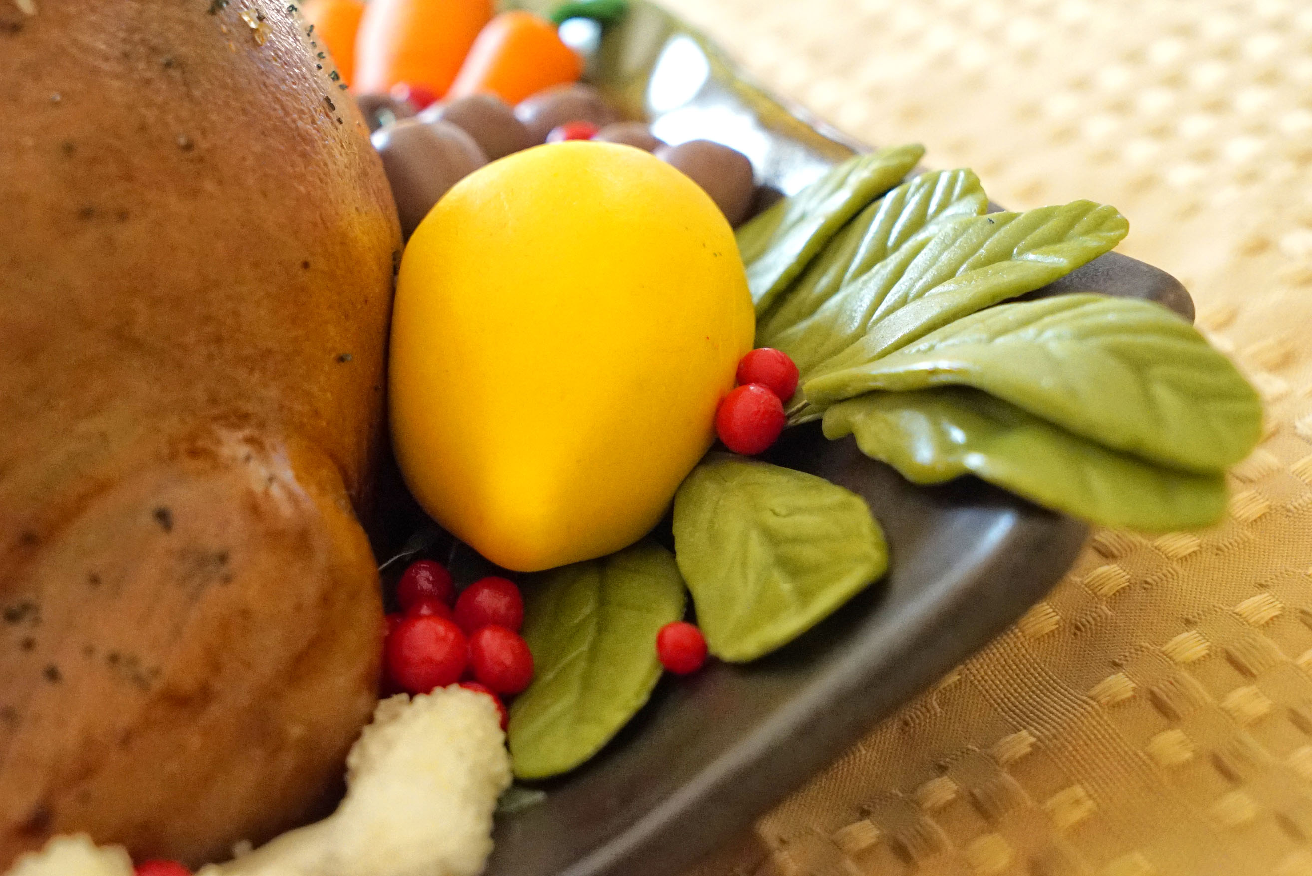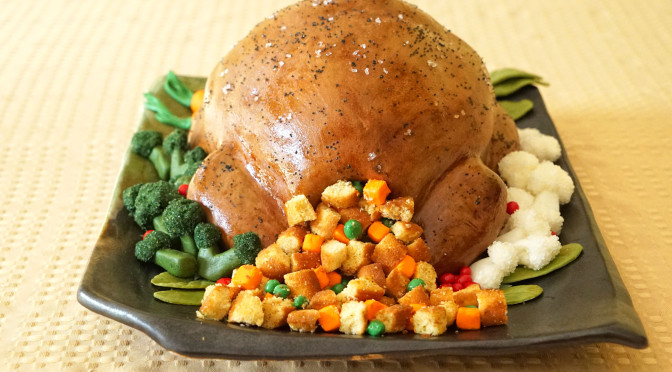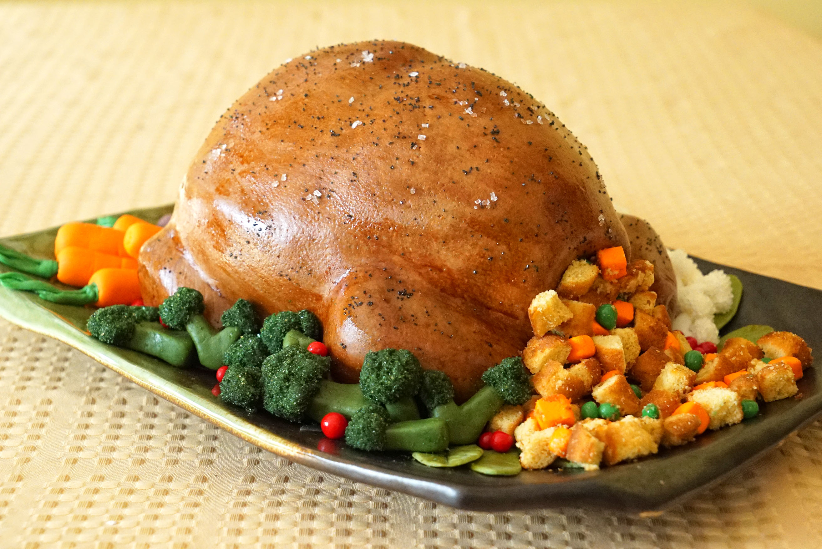 The mashed potatoes are made from mashed up vanilla cake mixed with vanilla frosting, and topped with a slightly melted-looking yellow square of fondant as the butter: