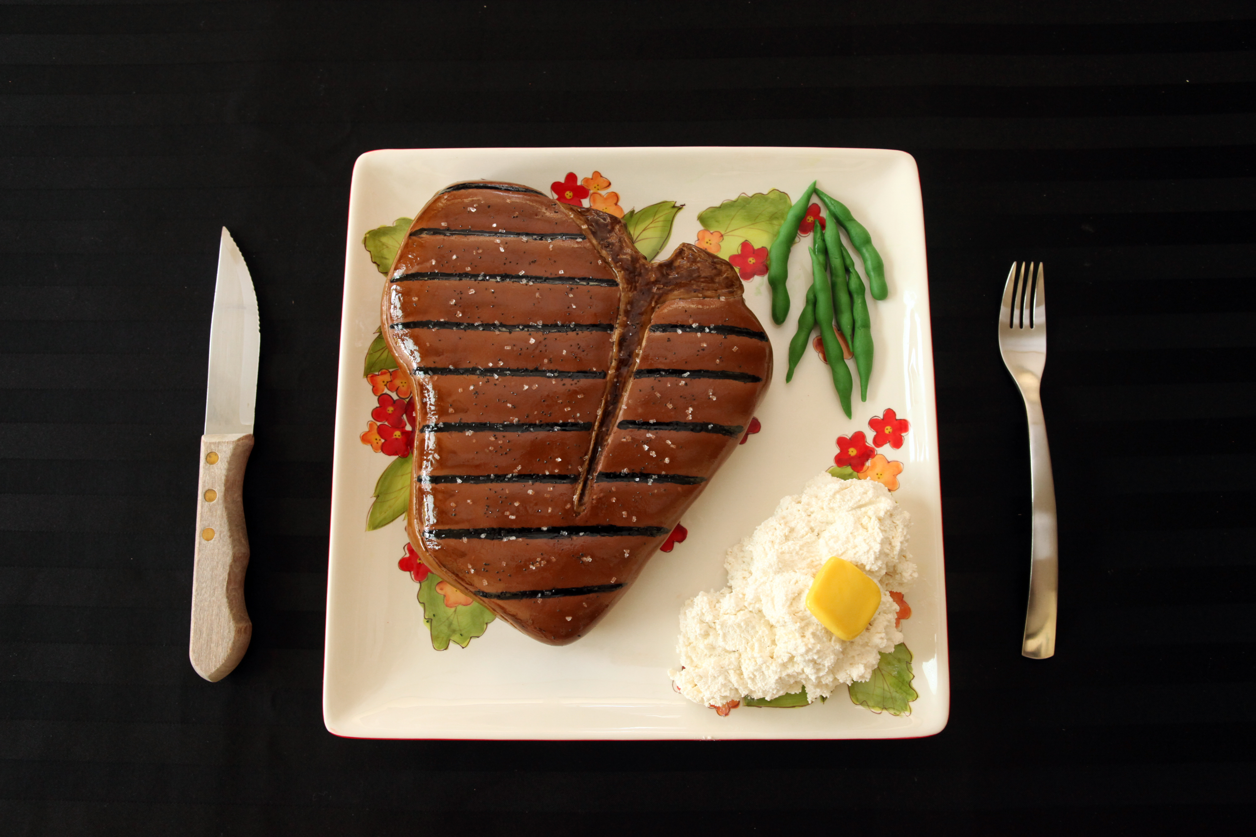 I have the pleasure of being married to a baker. She goes by the name “The Cake Dealer.” When I first started this blog, she was pretty well into her baking hobby. She was asking me what kind of cake I wanted and I suggested a cake that looks like a steak. It’s only fitting, right?