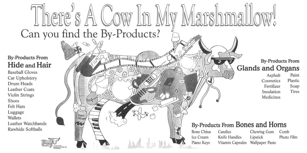 I haven’t independently verified all uses claimed on the Snopes chart, but the Facts About Beef chart is 100% legit and it looks like whoever made the Snopes pic just grabbed the same list from the BeefUSA graphic. The overall point is that beef byproducts are in a lot of things we use every day. It’s not like we just kill cows, cut the meat off and fling the carcass into a ditch on the side of the road. There’s really no waste.